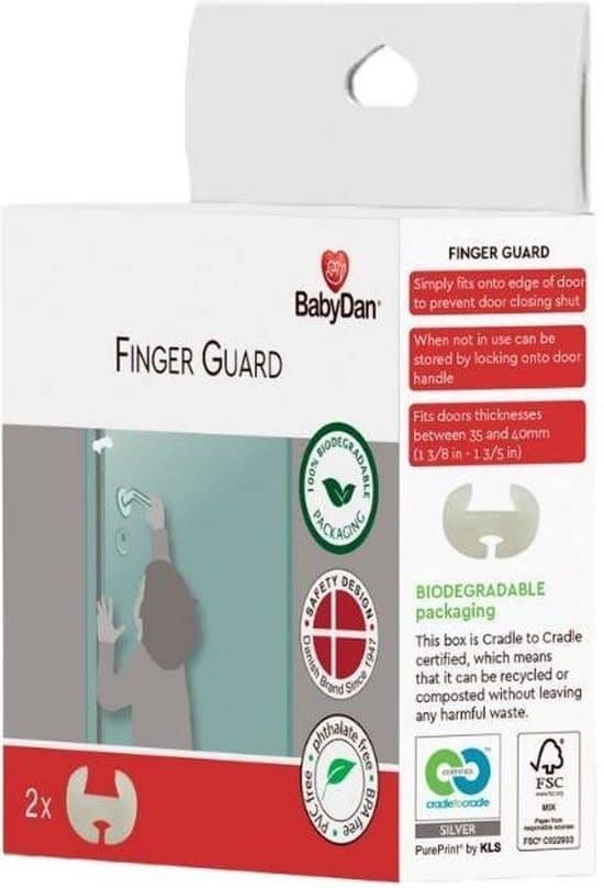 De deurstop zorgt ervoor dat de vingers van het kind niet bekneld raken. Te gebruiken voor binnendeuren van alle soorten materialen en met alle soorten scharnieren. Bedoeld voor deuren met een dikte tussen 35 mm en 40 mm. Verpakt in 100% biologisch afbreekbare verpakking, vrij van schadelijke chemicaliën en zware metalen.