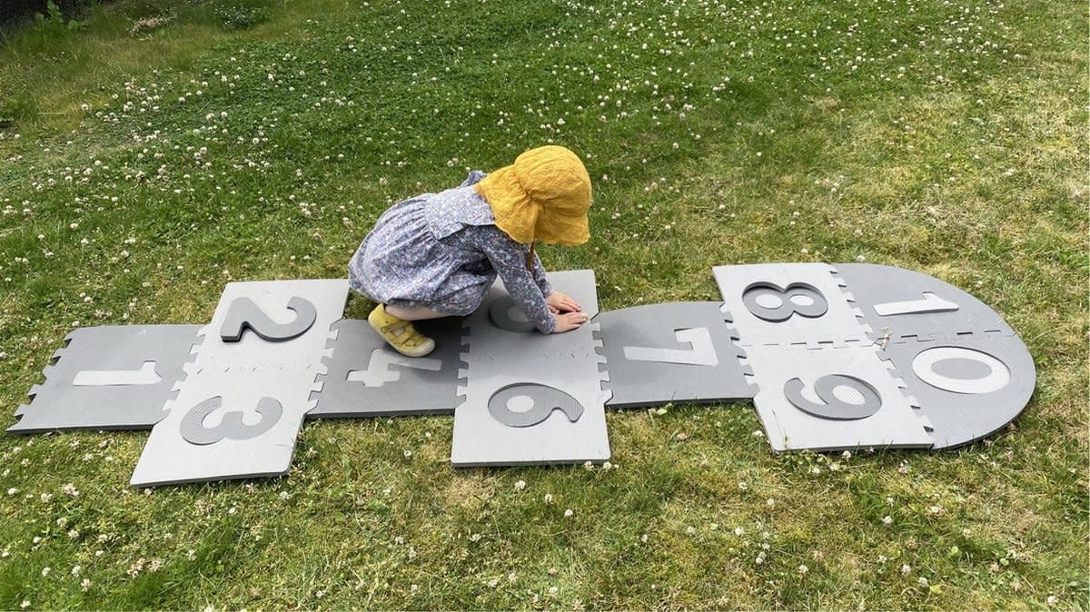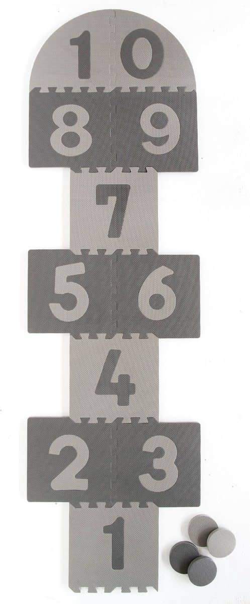 Hinkelpad van dik foam (inclusief 4 pionnen). De cijfers kunnen er worden uitgehaald zodat de speelmat ook kan worden gebruikt om te leren of als vormsorteerspel kan dienen voor kleinere kinderen. De mat is zacht om op te spelen en het materiaal heeft een isolerende werking die beschermt tegen kou van onderen.