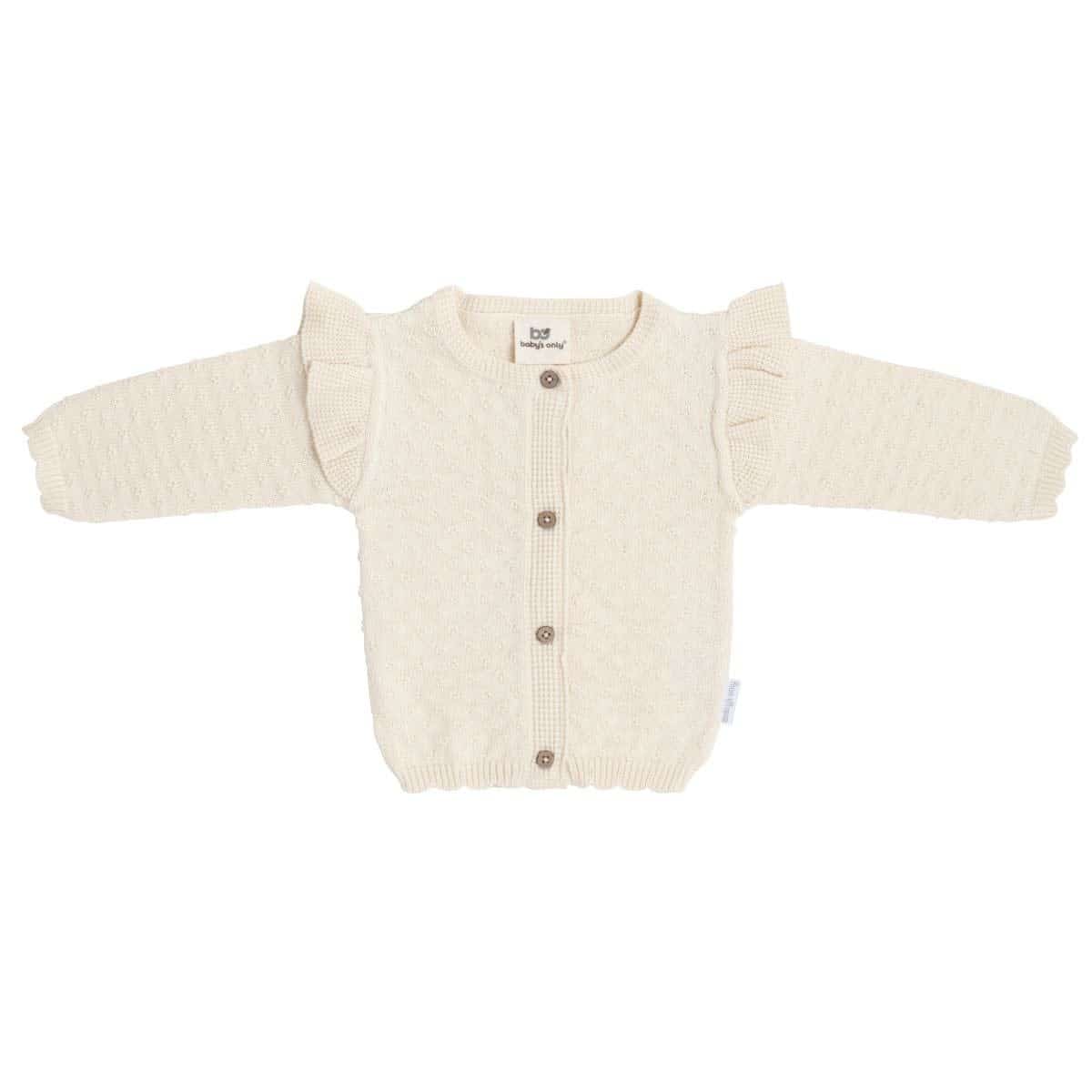 Geef je kleintje het allerbeste met het gebreide vestje uit de Miracle collectie van Baby’s Only. Dit prachtige vestje is gemaakt van 100% ecologisch katoen, wat het heerlijk zacht maakt voor het gevoelige huidje van je kindje.Het vestje is verkrijgbaar in verschillende kleuren en in de maten 56 tot en met 68, zodat je altijd de perfecte pasvorm kunt vinden. Het is voorzien van een bijzonder en schattig breipatroon, ruffles op de schouders en schattige knoopjes, die een stijlvolle touch toevoegen aan elke outfit. Dankzij de hoogwaardige materialen blijft het vestje kleur- en vormvast, zelfs na veelvuldig wassen.Dit vestje is een echte musthave in de garderobe van je kindje. Het is leuk om te combineren met de overige kledingstukken uit de Miracle collectie, maar past ook perfect bij andere collecties van Baby’s Only. Kies voor het Baby’s Only gebreide vestje uit de Miracle collectie en geef je kleintje een mix van stijl, comfort en duurzaamheid!
