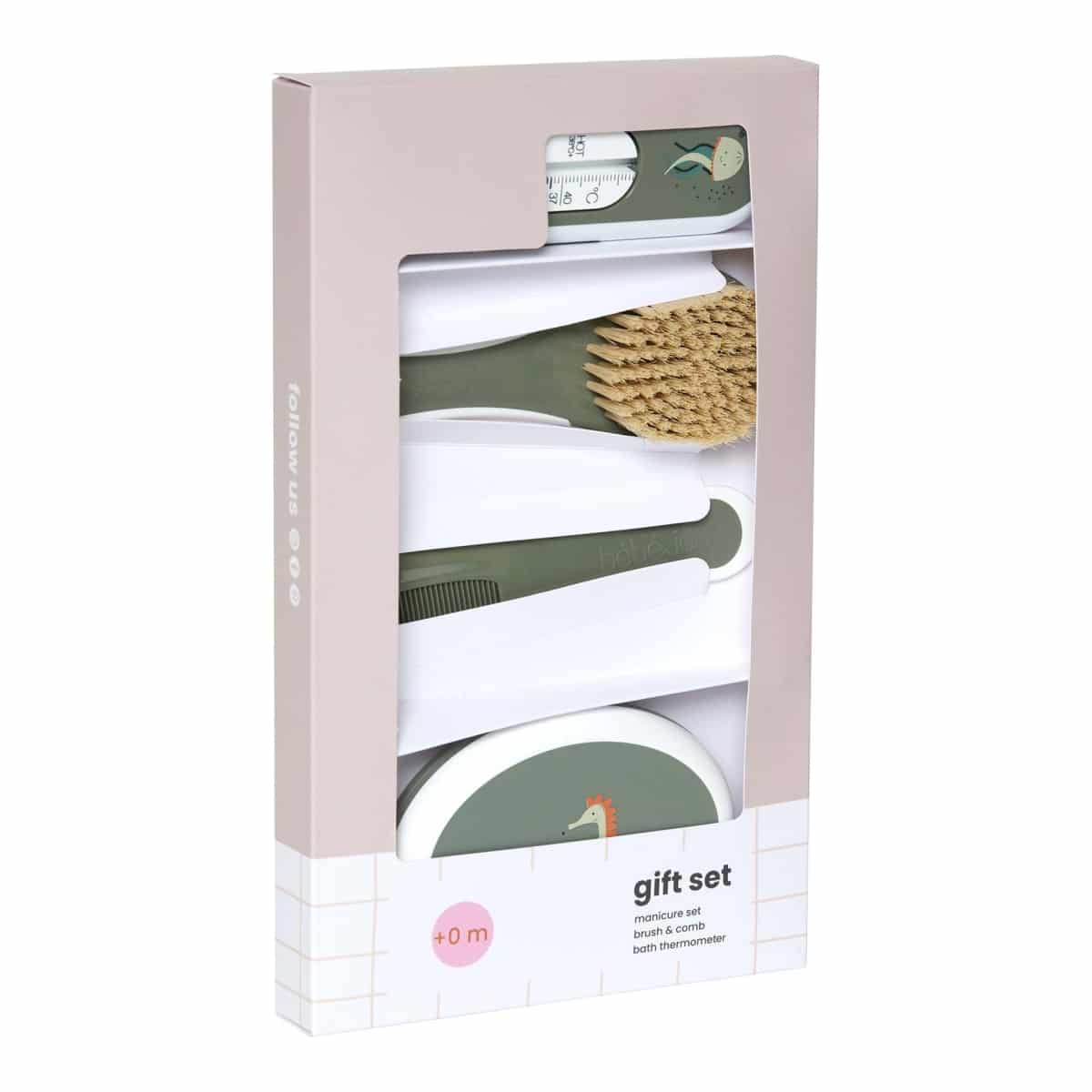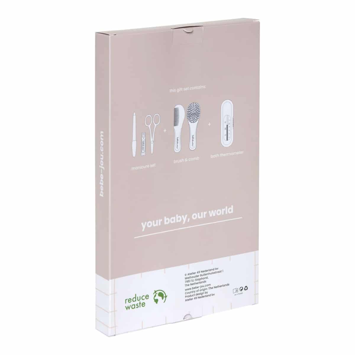 Een praktische verzorgingsset van bébé-jou om toekomstige ouders kado te geven. In deze set zit een kapset, manicureset en een badthermometer. Drie basisproducten die je nodig hebt voor een goede verzorging van je pasgeboren kindje.