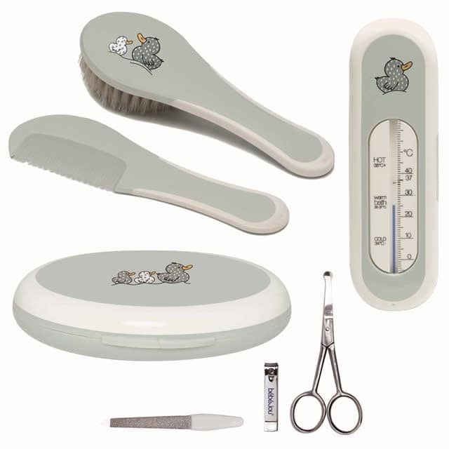 Een praktische verzorgingsset van bébé-jou om toekomstige ouders kado te geven. In deze set zit een kapset, manicureset en een badthermometer. Drie basisproducten die je nodig hebt voor een goede verzorging van je pasgeboren kindje.