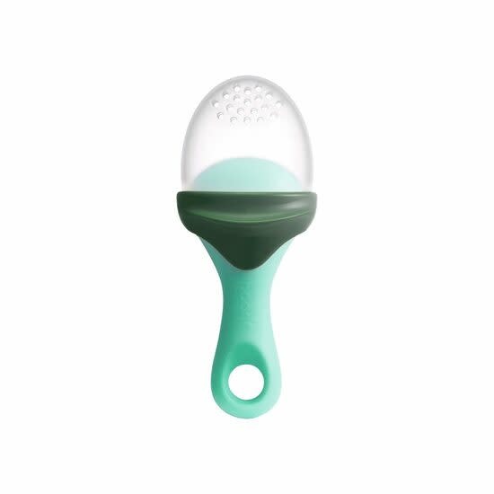 Deze siliconen voedingsbijtring is perfect om je kleintje zelfstandig te leren eten, verschillende smaken te leren kennen of om de pijn van doorkomende tandjes te verzachten. Je vult de lepel met voedsel (groenten, fruit, bevroren voedsel …) en het eten wordt via de kleine gaatjes bovenaan in de lepel naar buiten geduwd. De voedingsbijtring kan makkelijk aan een fopspeenkoord bevestigd worden en mag bovendien in de vaatwasser. Aanbevolen leeftijd: vanaf 6 maanden.