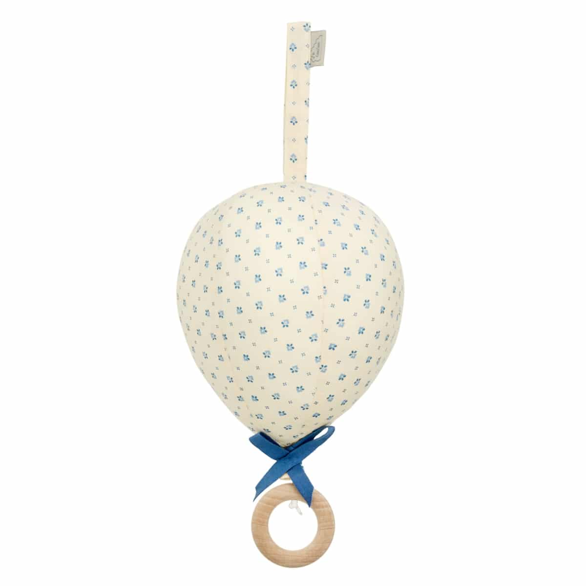 The mobile is shaped as a balloon with a little bow in cotton tape. Pull the wooden ring, and the music starts.