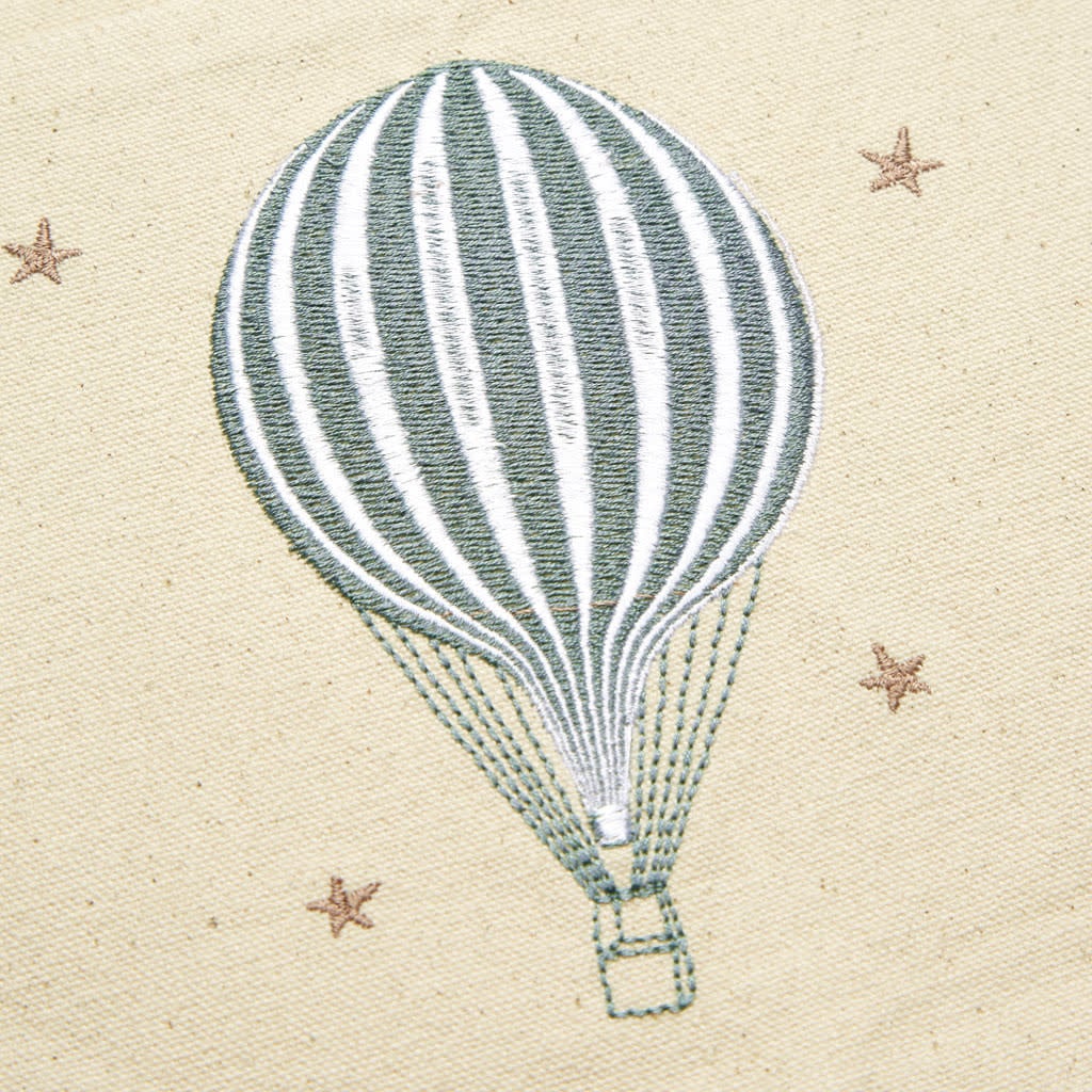 Add charm and functionality to the nursery or kid’s room with our decorative and practical Wall Pocket in the whimsical Dreamland theme. Made from GOTS-certified heavy canvas, this versatile accessory offers convenient storage and elegant decor. Featuring fine embroidery of a rising Hot Air Balloon, inspired by our popular Dreamland print, it includes two sweet pompoms at the bottom corners for a charming vintage touch. Easily hung with metal rings, this wall pocket is perfect for organizing small items, whether essentials for the changing table, utensils for the kid’s desk, or toys and other treasures, while bringing cosy character to your kid’s room.