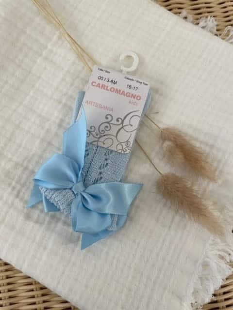 Carlomagno – Gehaakte kniekous zacht blauw met strik op zijkant