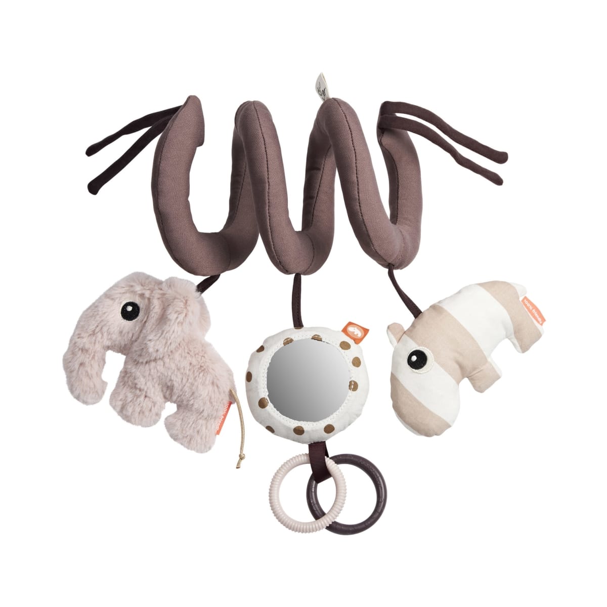 Let little fingers and eyes explore the sweet activity spiral in soft powder tones and golden details. Soft Elphee will thrill you with soft touches and a sweet rattling sound. Squeeze Ozzo’s tummy and hear the crackle. The little mirror is perfect for curious eyes and itchy gums can find relief in the two teething rings. The flexible activity spiral can be fastened to the cot, car seat, pram or even mummy’s arm. A perfect on-the-go entertainment.
