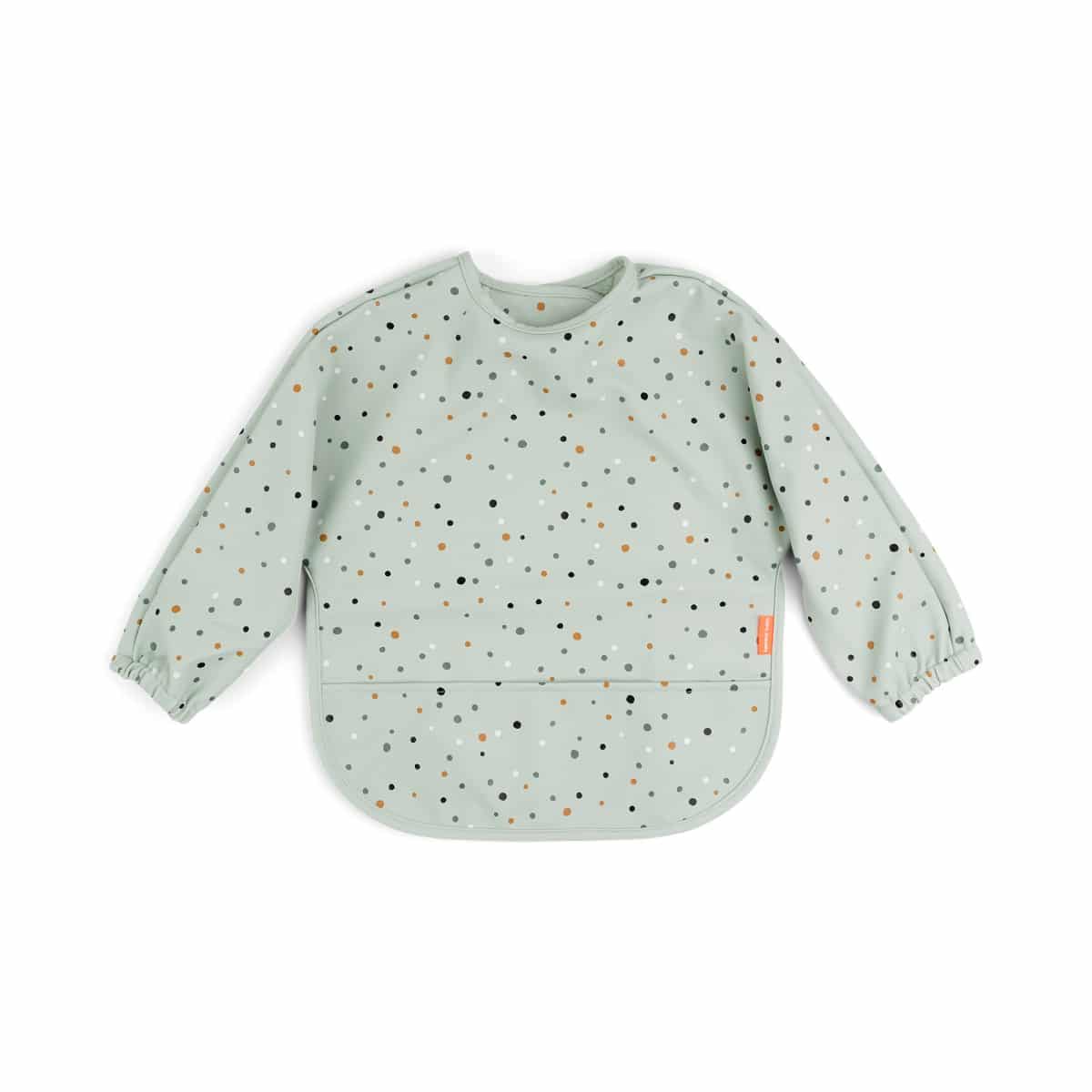 Learning to eat on your own can get messy! The Sleeved pocket bib protects your little eater during mealtime or when colouring, painting or getting creative with other stuff. An adjustable double closing makes sure that it fits both babies and toddlers. The soft bib is waterproof and has practical elasticated sleeves to keep your little one dry. It’s easy to wipe clean and will save you a lot of cleaning time. The cute green bib is covered with Happy dots in soft colours.