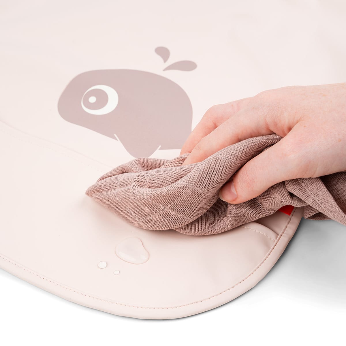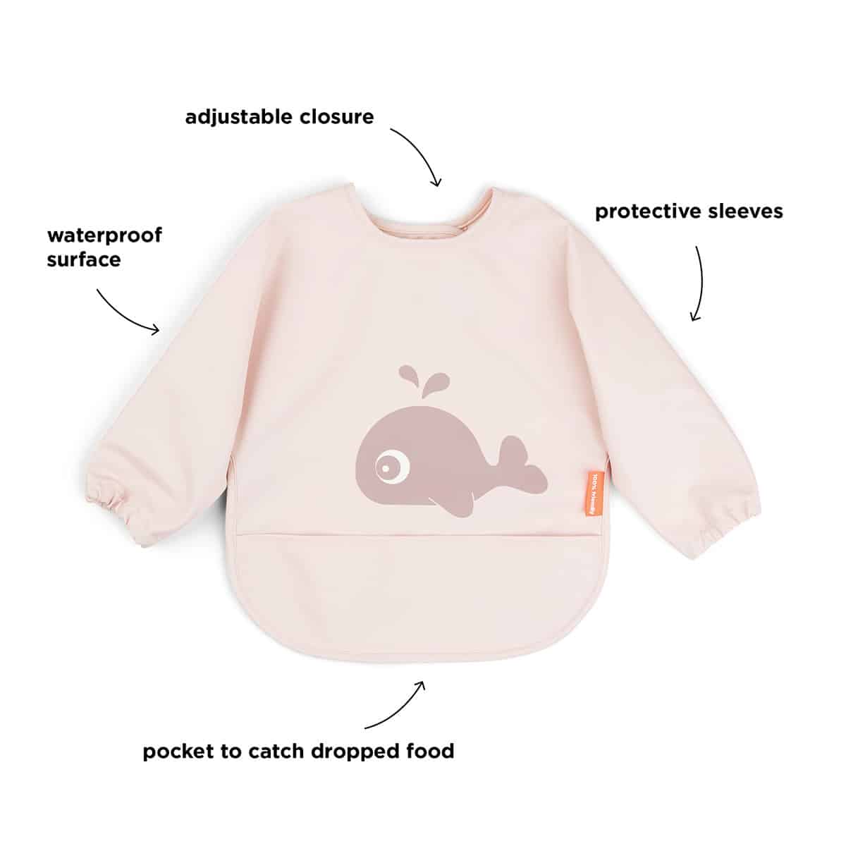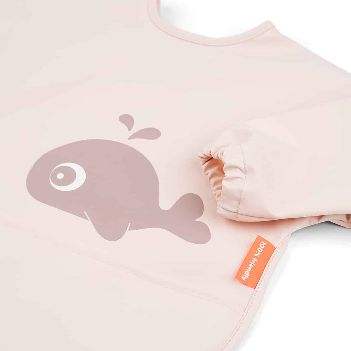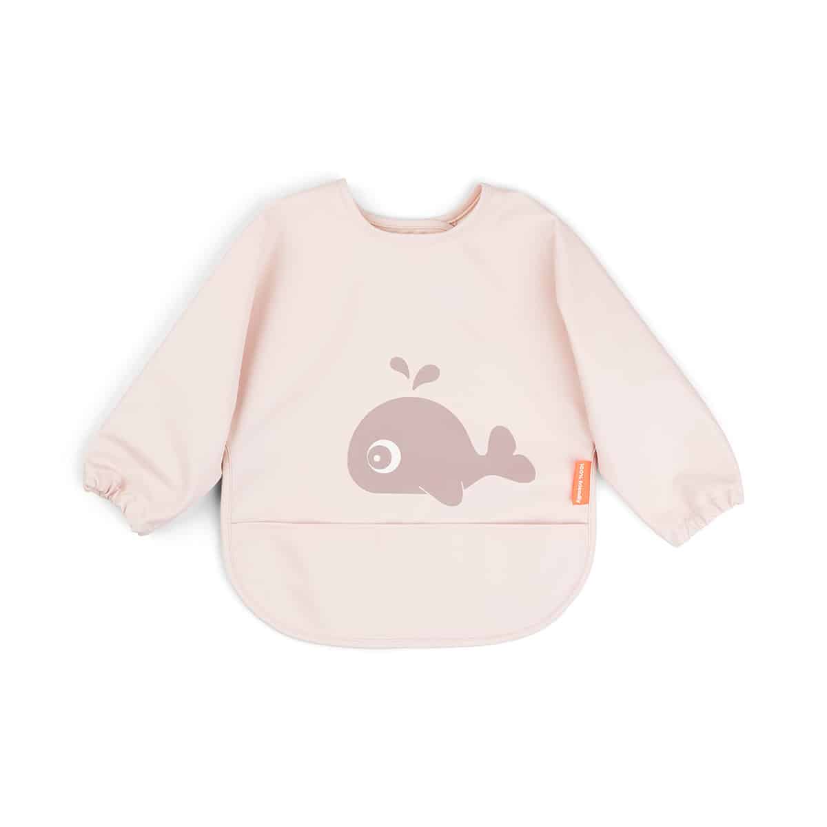 Learning to eat on your own can get messy. The sleeved pocket bib protects your little eater during mealtime or when getting creative. An adjustable double closing makes sure that it fits both babies and toddlers The soft bib is waterproof and has practical elasticated sleeves to keep your little one dry. It’s easy to wipe clean and will save you a lot of cleaning time. The sleeved pocket bib is in a cute powder colour with a motif showing Wally the mighty whale splashing water.