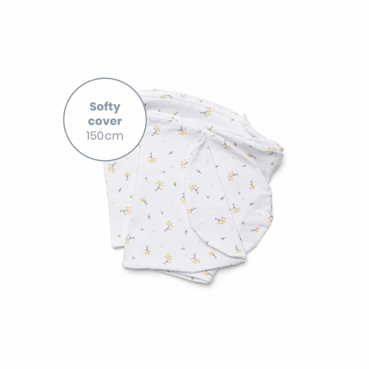 Doomoo Softy is 150 cm (afmetingen genomen vanaf de buitenkant van het kussen wanneer het kussen in hoefijzervorm is geplaatst). Het is ons kleine voedingskussen. De Softy is gemaakt van bi-elastisch materiaal (rekt gemakkelijk uit).