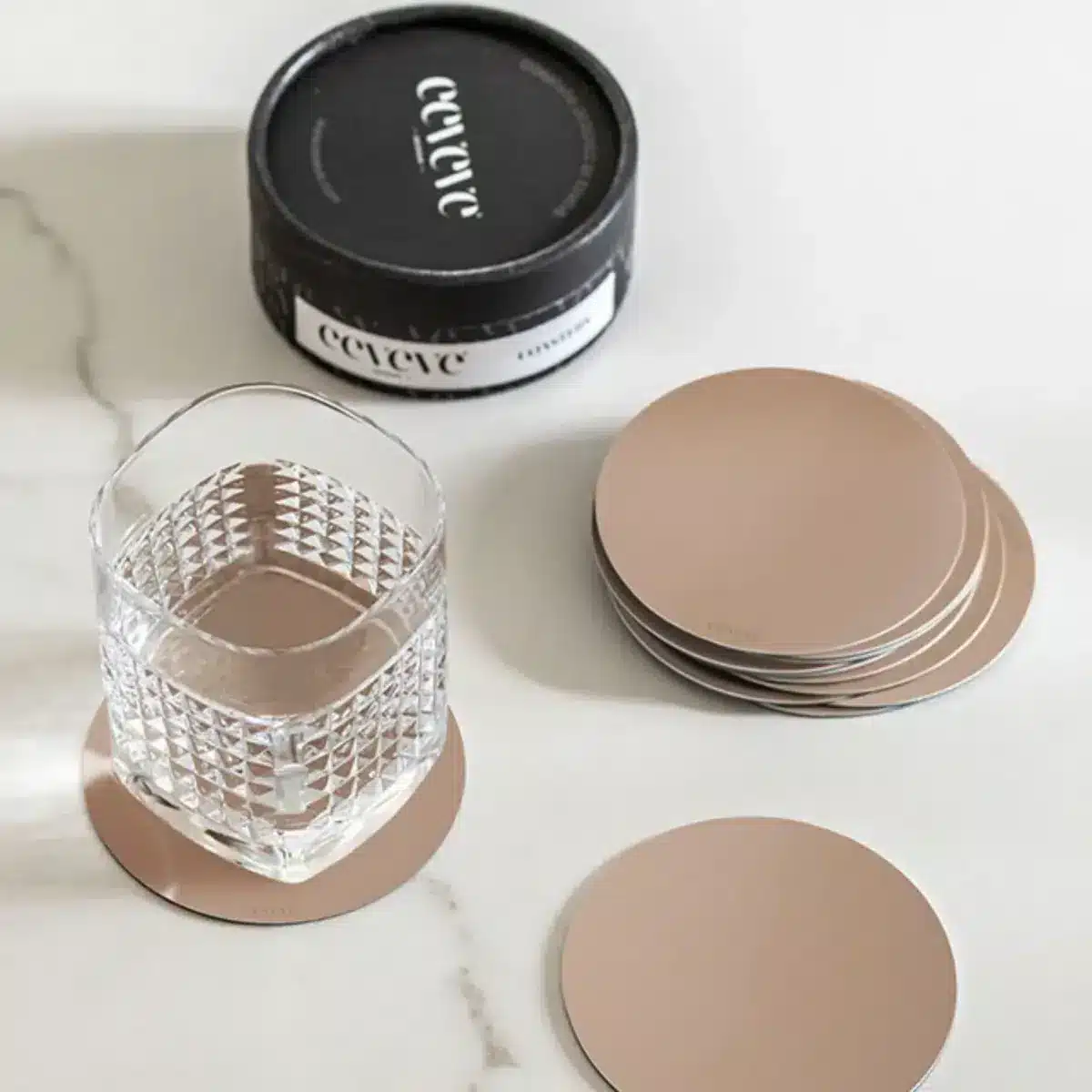 De afwasbare onderzetters van Eeveve zijn naast de luxe uitstraling super praktisch! Je glas blijft niet plakken aan de onderzetter en beschikt over een antislip laag. Je kunt gemakkelijk de kringen van het drinken verwijderen door de onderzetters in de afwasmachine te plaatsen.
