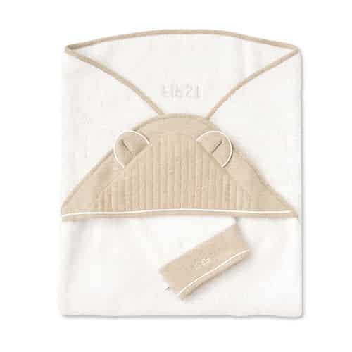 Badcape en washandje in badstof met gemattelasseerd beige jersey & teddy oortjes.