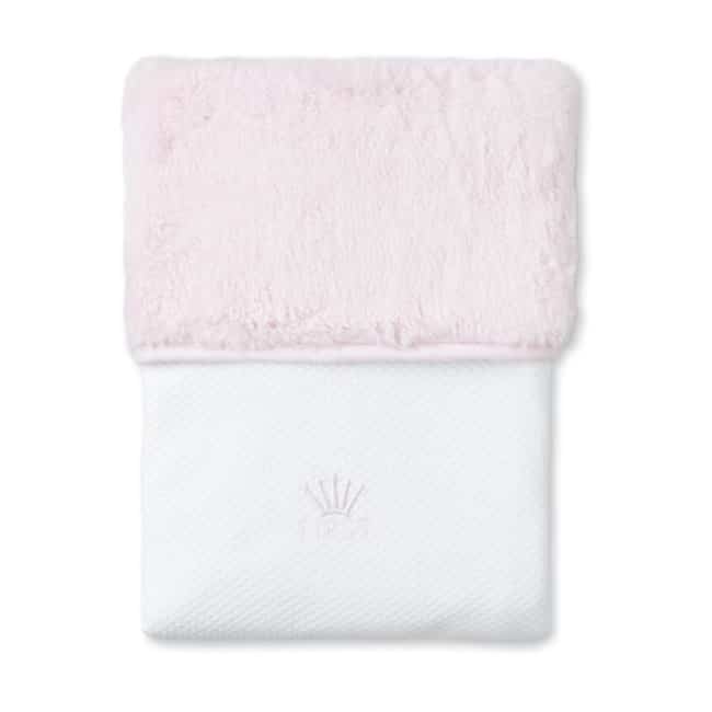 Gewafeld katoenen jersey plaid, gevoerd met rose teddy, afgebiesd met rose biais.