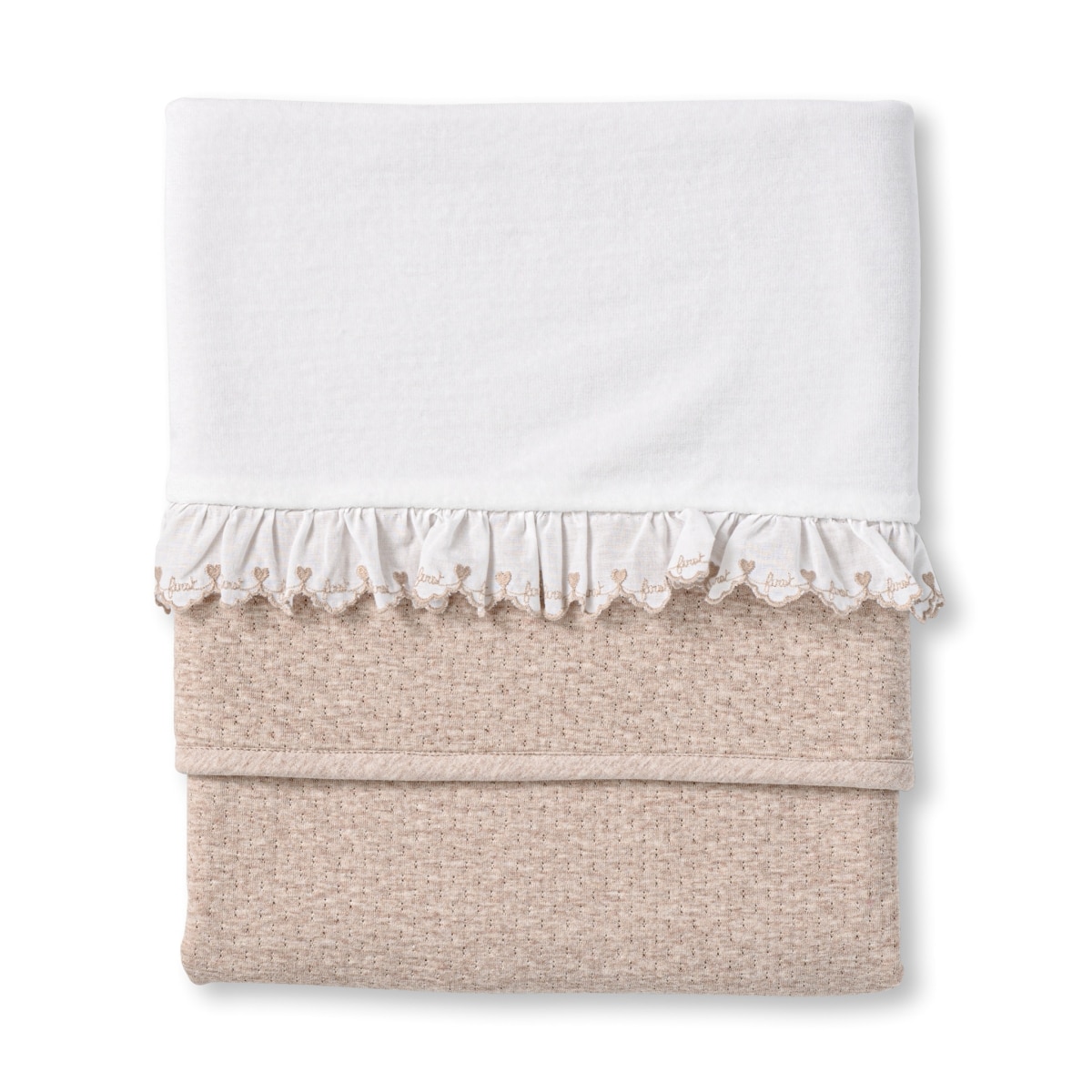 Fantasie jersey beige LONDON dekentje, gevoerd met velours, afgewerkt met FIRST geborduurde franjes