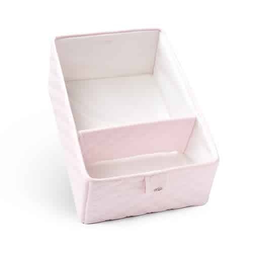 Opbergdoos in roze doorstikte jersey,bodem in wit gelamineerd katoen en afgebiesd met roze biesje