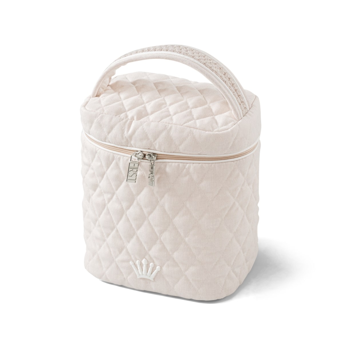 Gewatteerde katoenen toilettas met een gelamineerde binnenkant, perfect om je benodigdheden netjes en veilig te houden. De 2-weg rits zorgt voor gemakkelijke toegang, terwijl het handvat van kant met witte bies een vleugje verfijning toevoegt.