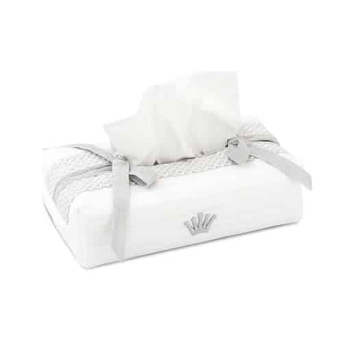 Wit gemattelasseerd kleenex hoesje in jersey, afgebiesd met geborduurde rand.