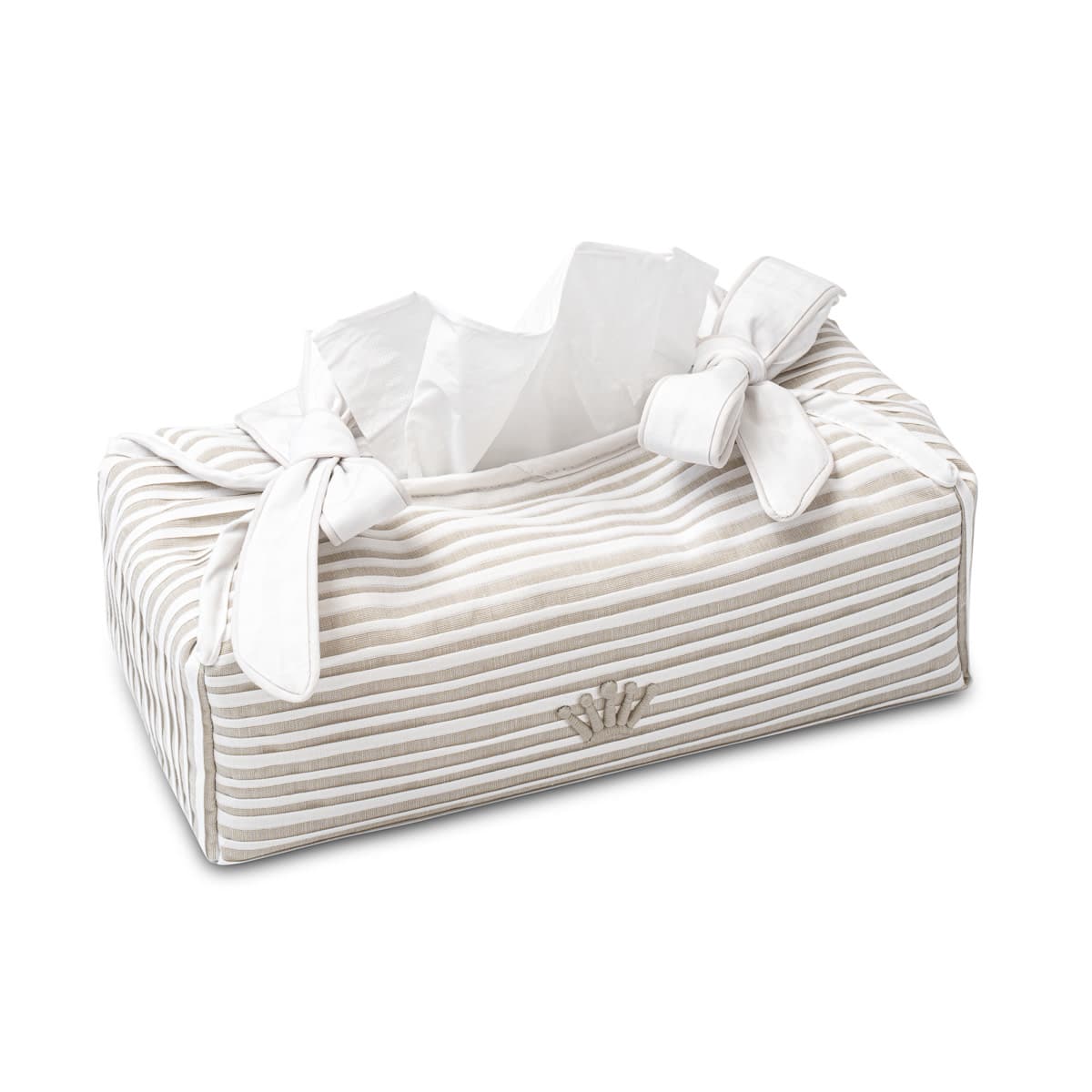 Kleenex hoesje in gestreept wit/beige 3d katoen & strikjes in wit katoen