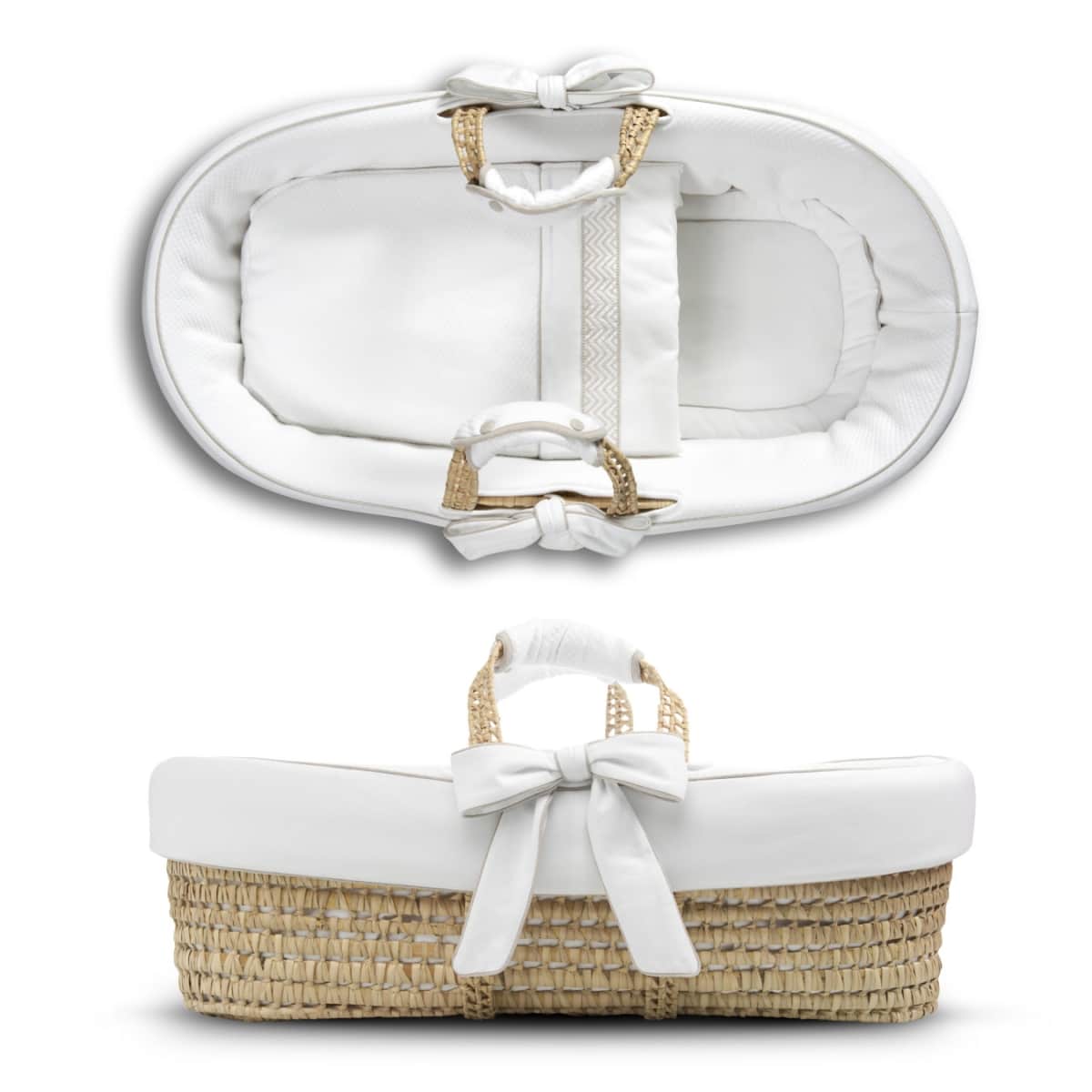 ‘soft touch’ Moses mand in 100% natuurlijke handgeweven palmbladeren , ovaalvormig, Textiel in witte doorstikte gewafelde molton met beige biesjes, afgewerkt met witte jersey, omkeerbare handgreep in gelamineerd katoen, inclusief matras, afneembare strikken, hoofdkussentje