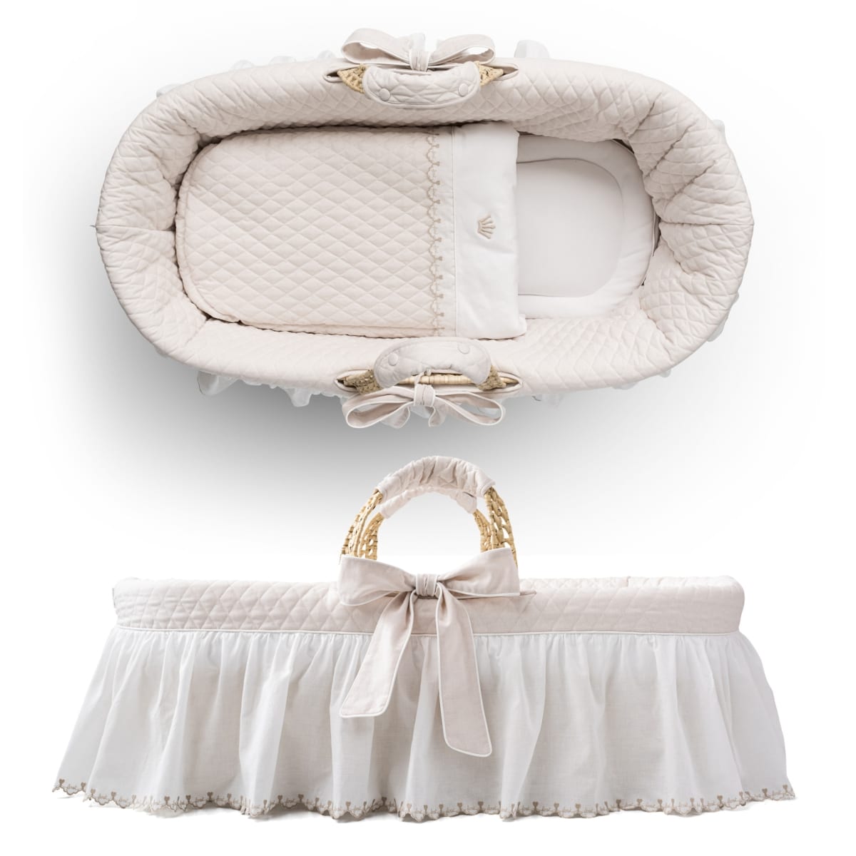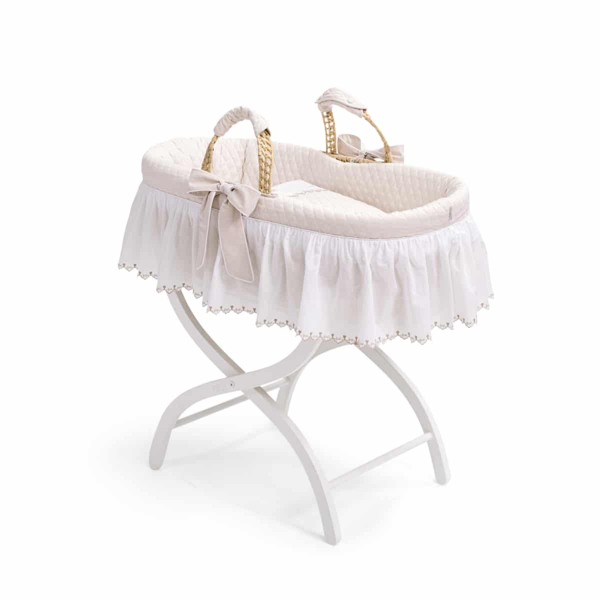 De ‘First’ wieg is gemaakt van 100% natuurlijk geweven palmbladeren. De set omvat de exclusieve ‘First’ gewatteerde jersey bumper, twee afneembare strikken (met drukknoopjes), een matras met een afneembare jersey hoes en een beddengoedset in wit gemattelasseerd katoen. Mooie details zoals een geborduurde hoes en FIRST-kantafwerking rondom de wieg.