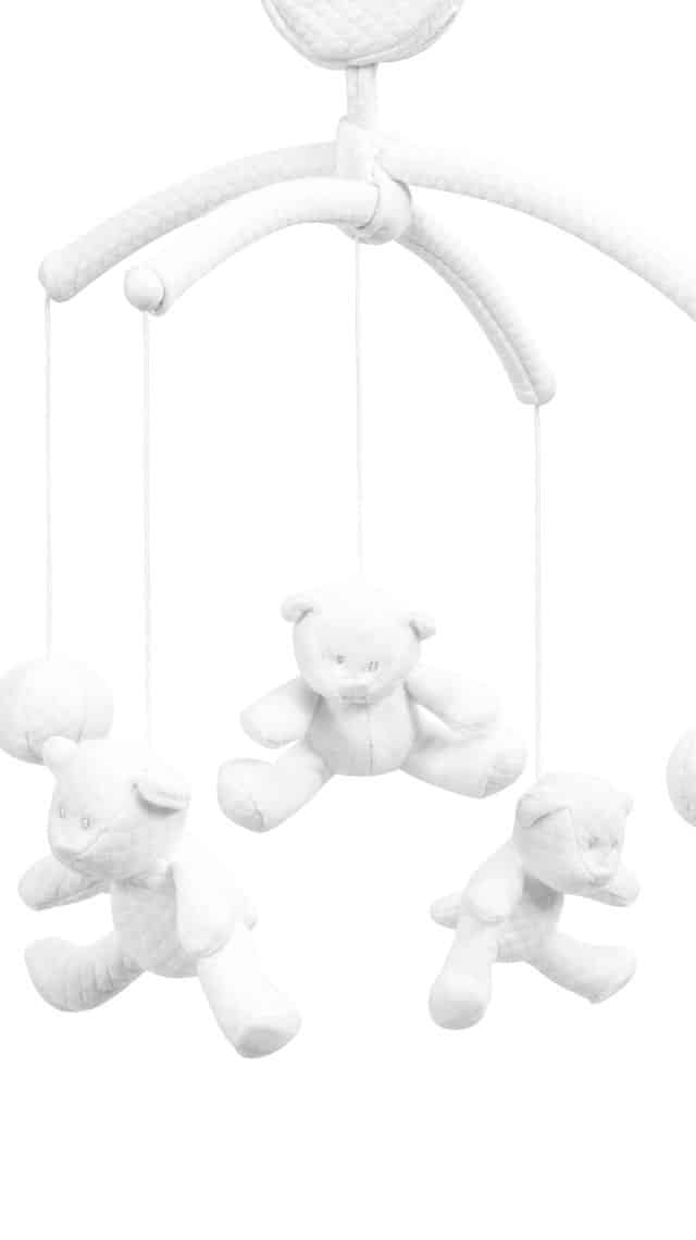 Mobiel voor bed of park in witte gewafelde jersey en fluweel,de arm is bekleed in grijs katoen, verpakt in luxe-hoesje