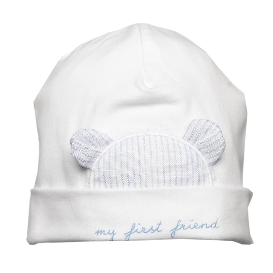 Zacht wit babymutsje van zachte jersey, met een gestreept teddybeertje met 3D-oortjes in lichtblauwe tinten. Afgewerkt met een geborduurde tekst ‘my first friend’ op de rand. Een schattig en knus detail voor elke outfit van een pasgeboren baby.