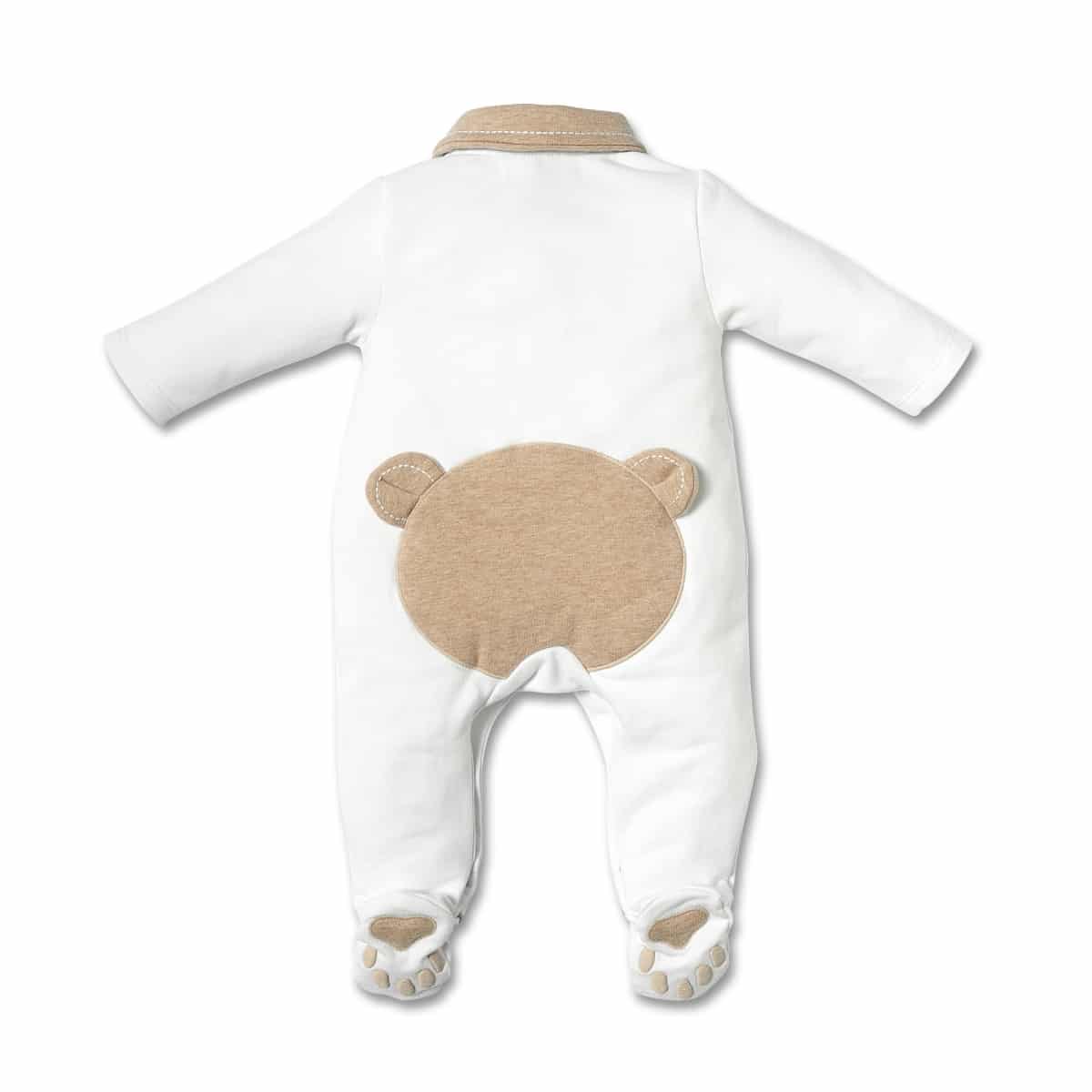 Combi in witte jersey met rose teddybeerkopje op de rugzijde, geborduurde berevoetjes met witte details. (INCLUSIEF GESCHENKDOOS)