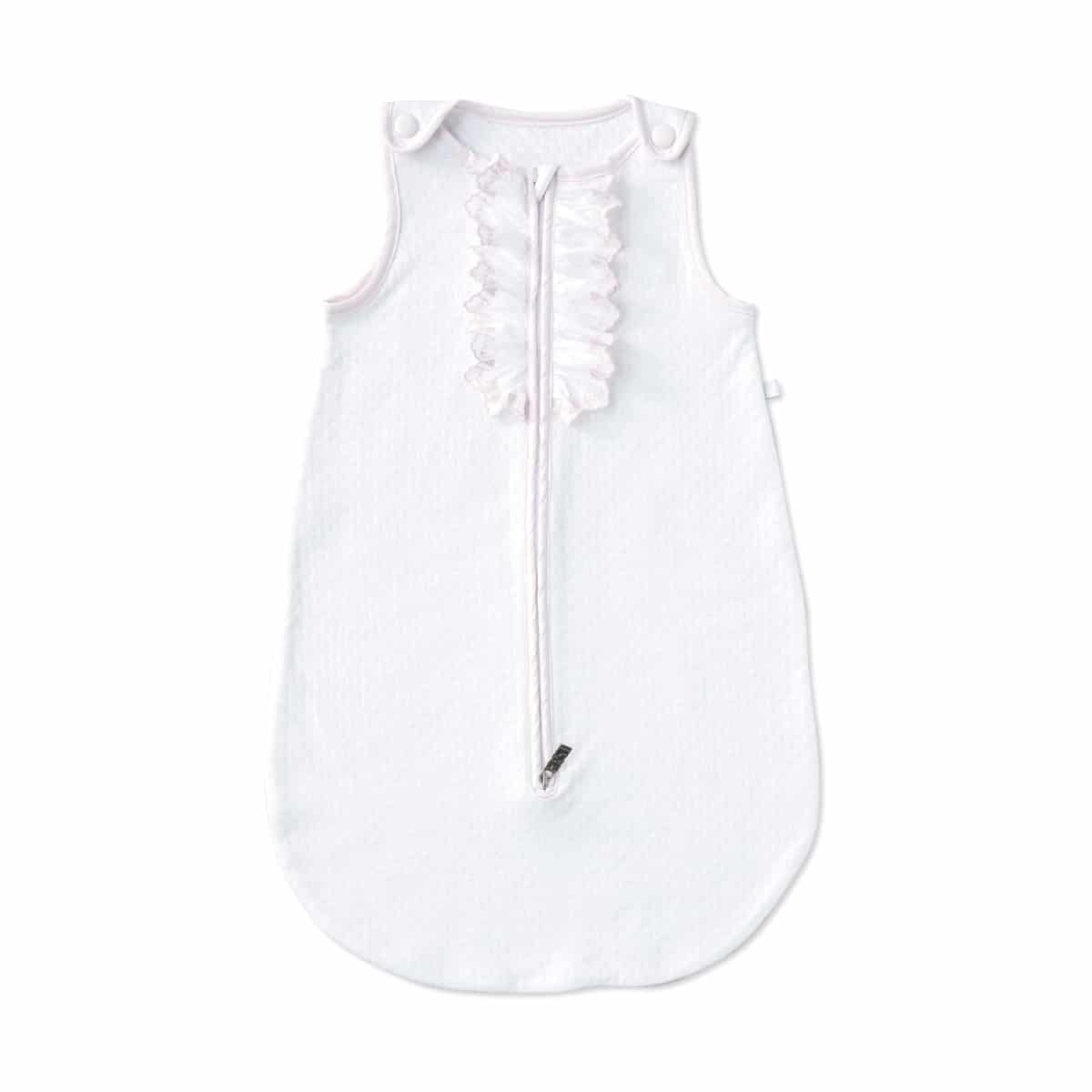 slaapzak in witte jersey London, afgewerkt met roze biezen en verfraaid met geborduurde kant.
