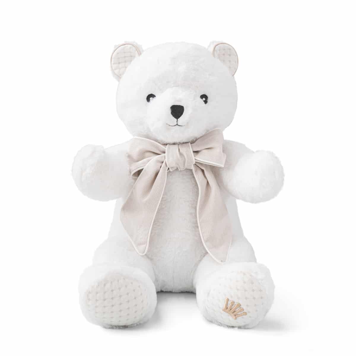 Maak kennis met Zoë, de eco-vriendelijke teddybeer van zachte witte bontstof. Zoë heeft gewatteerde oren van Oslo-stof en een charmante strik van beige katoen met witte bies en “First” borduurwerk. Met een hoogte van 37 cm is deze schattige teddybeer dezelfde als op ons REPLAY behang “My First Friends”.