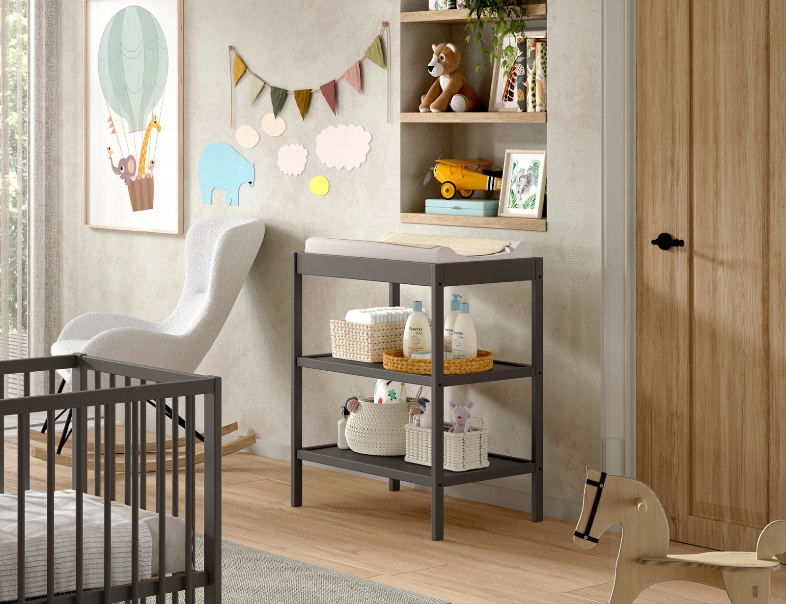 Ontdek de DINO verzorgingstafel in antraciet, een perfecte combinatie van functionaliteit en esthetiek, ontworpen om de moderne babykamer te verrijken. Deze zorgvuldig vervaardigde tafel biedt een ruim verversoppervlak aangevuld met twee open planken, waardoor alle babybenodigdheden binnen handbereik zijn. De natuurlijke houtafwerking straalt warmte uit en het eenvoudige ontwerp maakt dat het past bij verschillende interieurstijlen en thema’s