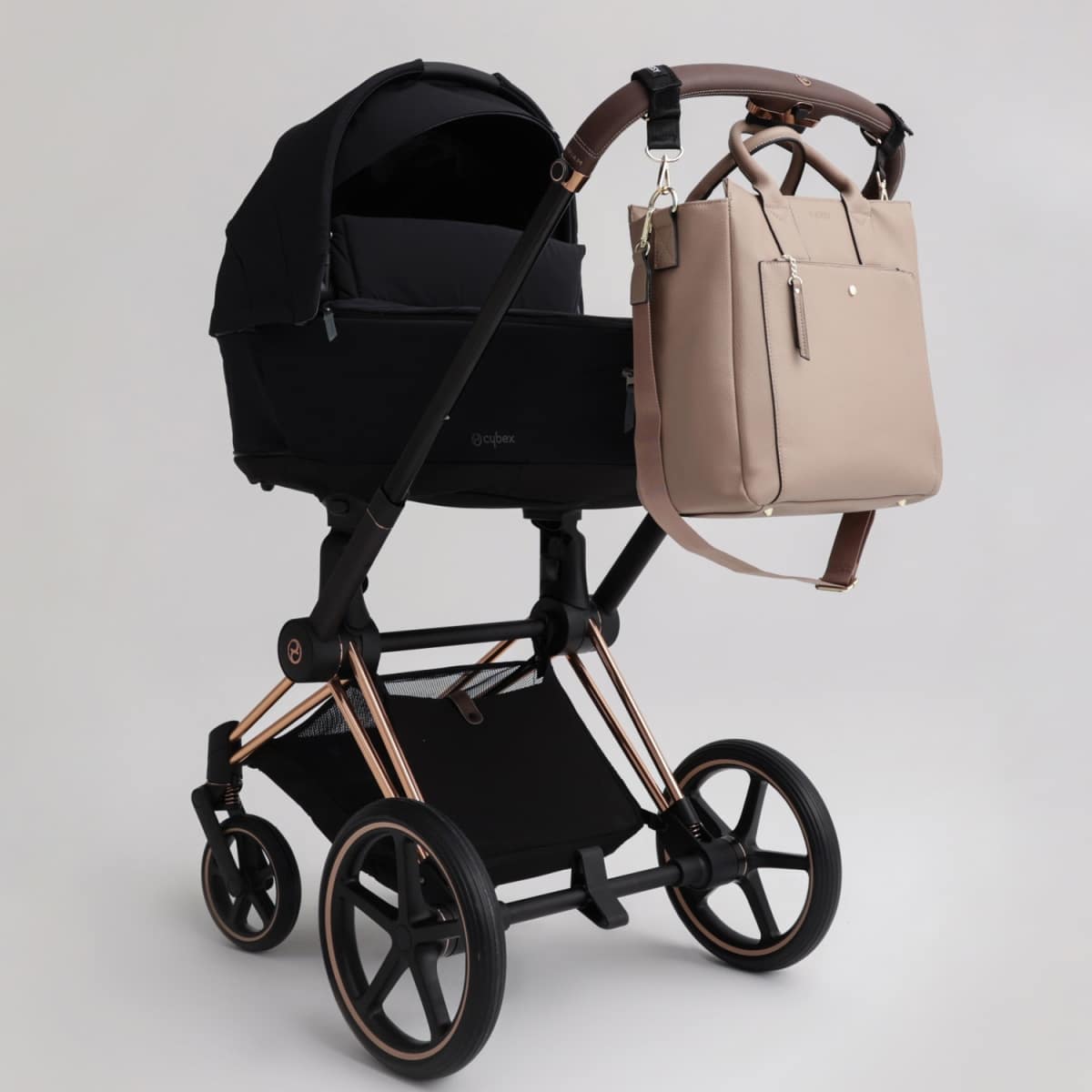 Kinderwagenhaken maken een eenvoudige installatie van de tas op elk kinderwagen- of wandelwagenmodel mogelijk. De haken zijn in lengte verstelbaar en af ​​te stemmen op het handvat van de kinderwagen. Ze kunnen van de tas worden losgemaakt en permanent aan de kinderwagen worden bevestigd, waardoor je de tas gemakkelijk en snel kunt ophangen, zelfs als je haast hebt.
