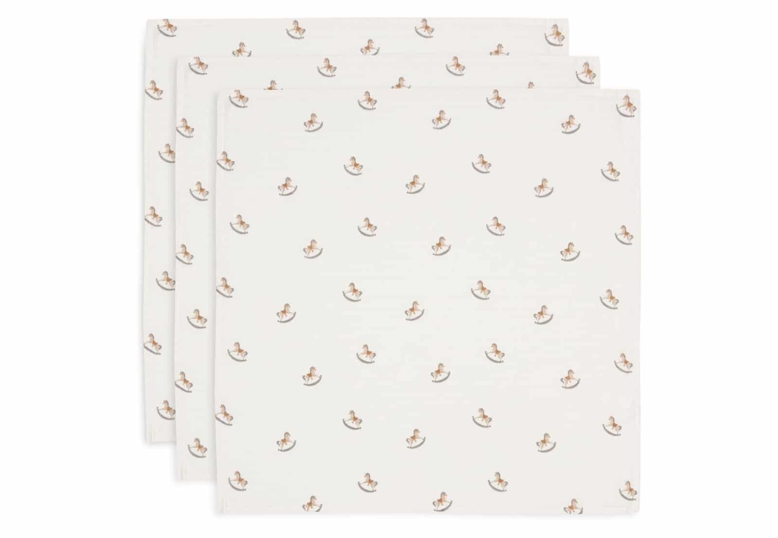 Van hydrofiele doeken kun je er geen genoeg hebben. Ze nemen enorm veel water op en drogen binnen no-time! Het thema Nostalgic Ride neemt ons mee terug in de tijd! Lieve hobbelpaardjes en beige tinten versieren deze fijne doeken, en jij hoeft nooit zonder te zitten doordat deze doeken per 3 komen! De Hydrofiele doeken hebben een formaat van 70×70 cm en dat maakt deze items super fijn in gebruik. Ben jij ook zo van van deze lieve print?
