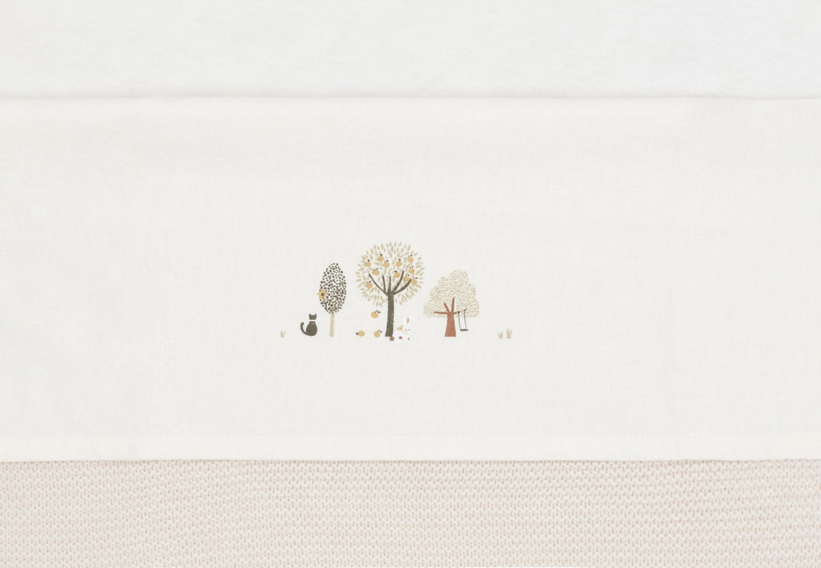 Dit laken heeft een schattige print van boompjes en een katje, allemaal op een oatmeal ondergrond, wat perfect past bij de rest van het Tiny Park thema. Het voegt een speelse en natuurlijke sfeer toe aan de babykamer, ideaal om het bedje van je kleintje mee te versieren. Combineer dit lakentje met leuke oatmeal dekentjes en maak het bedje helemaal compleet!