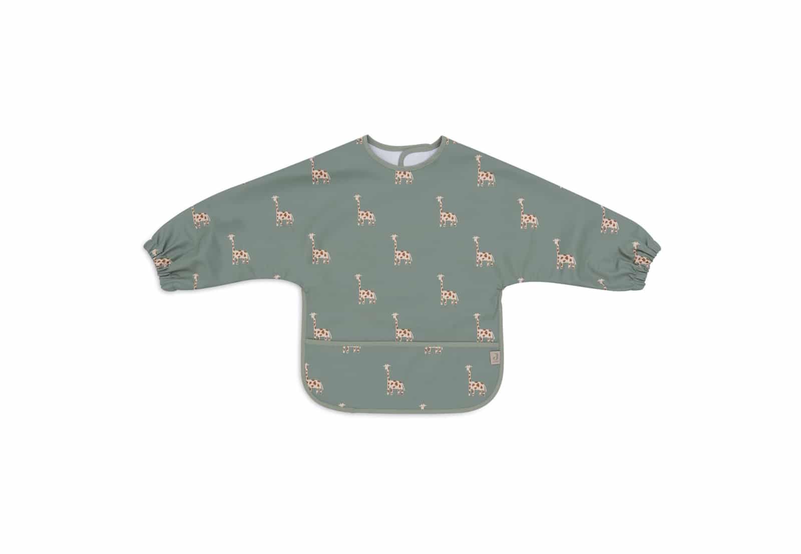 Deze slab met mouwen is geweldig! Als een schattig schortje beschermt het de kleertjes van jouw baby of dreumes extra goed, dankzij de handige mouwtjes. Ooit afgevraagd waarom er aan de onderkant een dubbel laagje stof zit? Daar is over nagedacht! Tijdens het zelfstandig eten druipt er geregeld voedsel langs de kin over de slab, maar de onderste rand van de slab vangt dit op als een handig opvangbakje. Dat ga je zeker waarderen! Niet alleen handig tijdens de maaltijden, maar ook bij knutselen en vingerverven. In ons schattige Jungle Jambo thema is deze slab nog leuker, versierd met giraffjes op een Ash Green kleurige achtergrond!