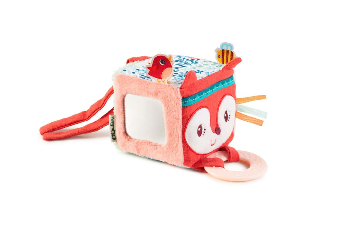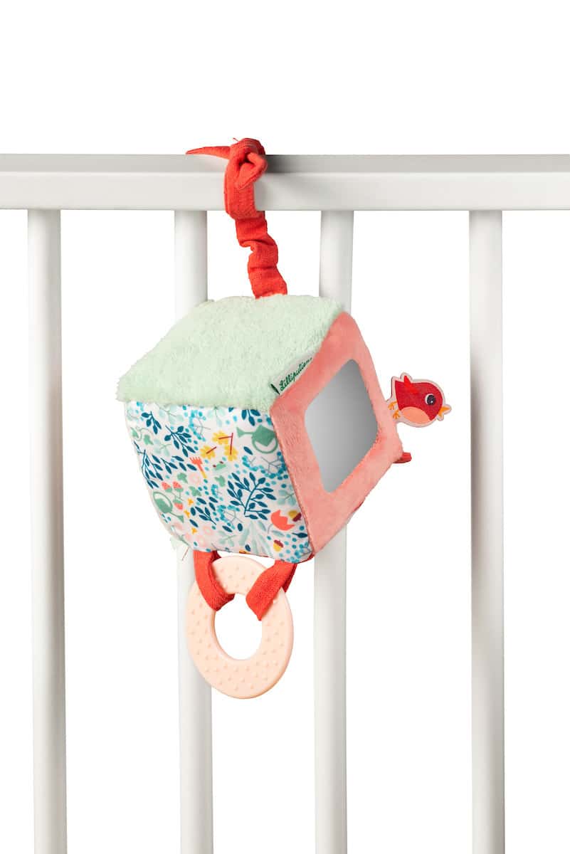 Op deze kubus met verschillende motieven en texturen valt er op elke zijde heel wat te beleven. Een bron van inspiratie en stimulatie voor kleine ontdekkers. Makkelijk te bevestigen dankzij het lint.