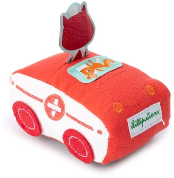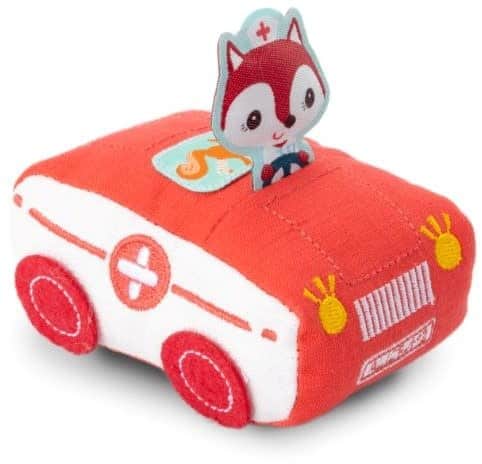 Eekhoorn heeft zijn been gebroken. Alice springt in haar ziekenwagen en snelt ter hulp. Deze zachte auto is ideaal voor kleine handjes. Even achteruittrekken en hop, de auto vertrekt.