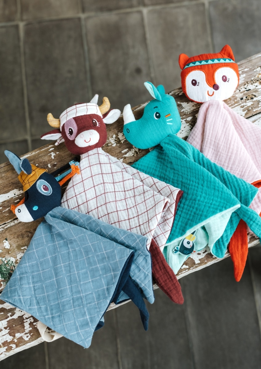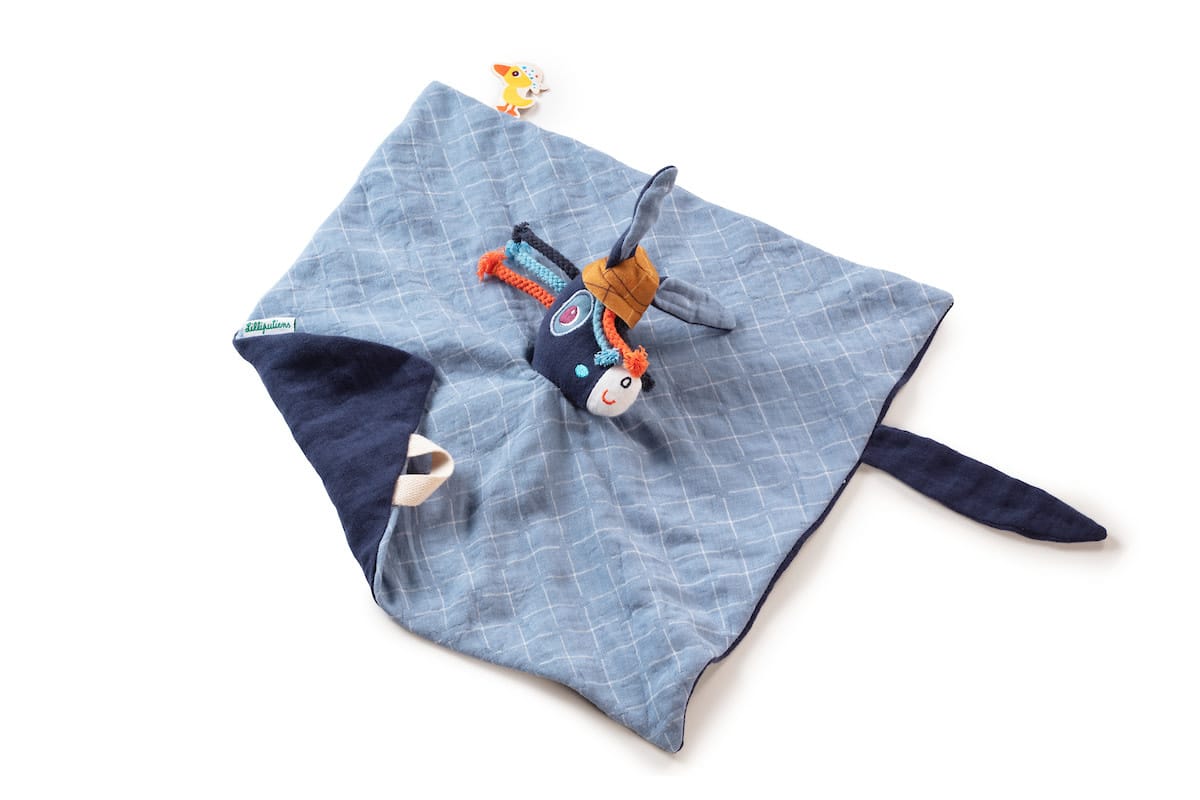 Dit knuffeldoekje gemaakt van organisch katoen biedt troost aan de allerkleinsten. Het hoofdje is een vingerpop en aan het knoopje kan je de fopspeen bevestigen.