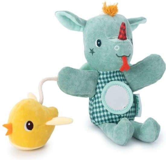 Het zachte handpopje Joe past precies in je jaszak of tas en brengt je kindje al snel aan het lachen. Het knisperend vogeltje en de spiegel stimuleren de zintuigen.