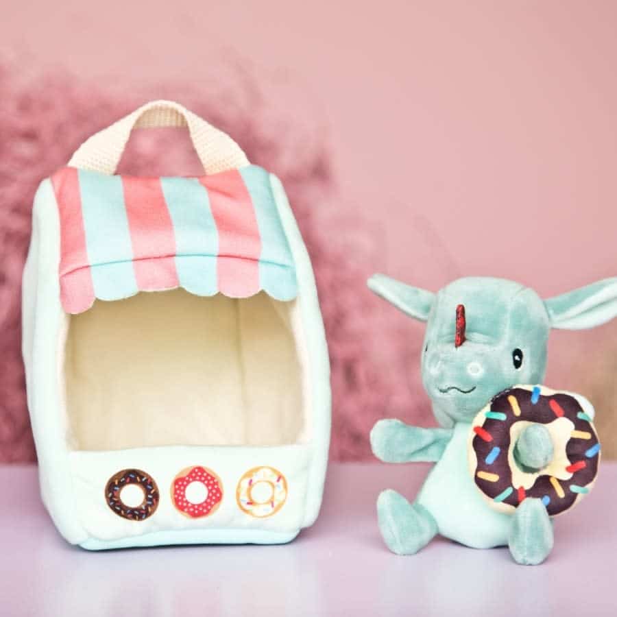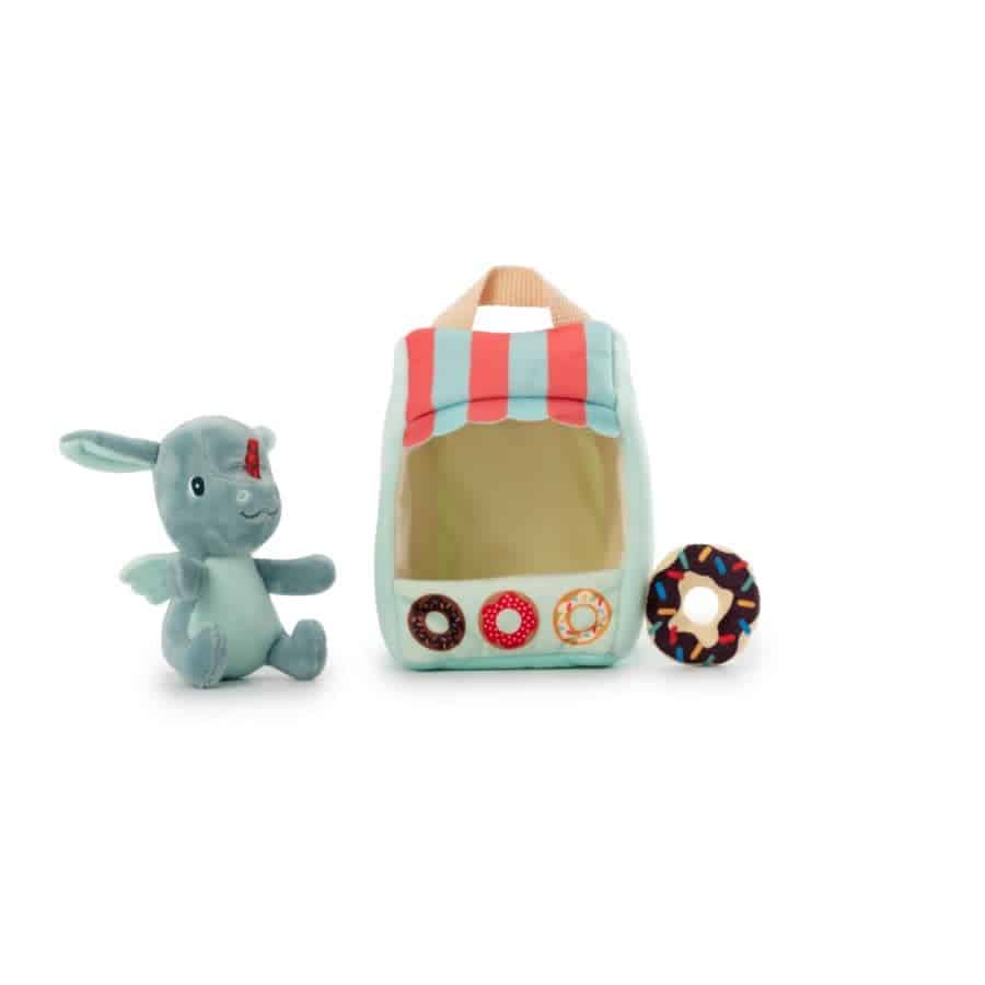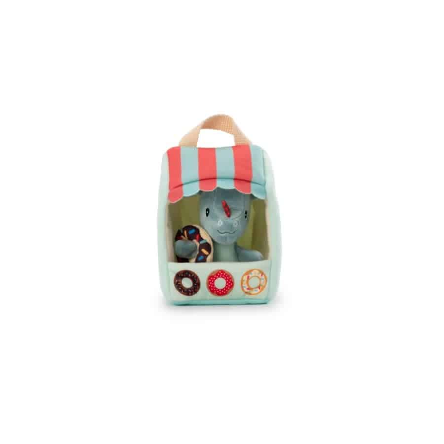 Wie heeft er zin in een donut ? Joe biedt in zijn kraampje de heerlijkste donuts aan. Helemaal uit stof vervaardigd, is dit speeltje makkelijk mee te nemen en prikkelt het de verbeelding.