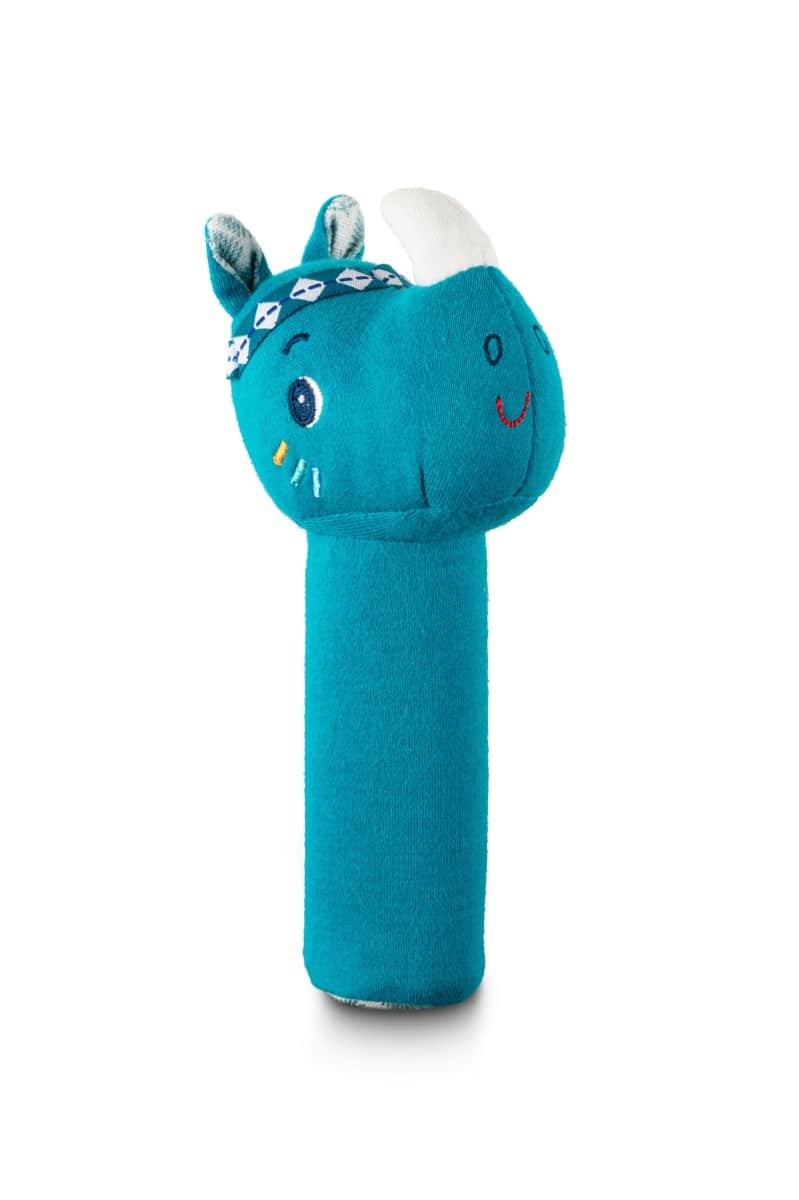 Deze knijprammelaar, gemaakt van organisch katoen, stimuleert de fijne motoriek van je kindje en leert het alles over actie en reactie.