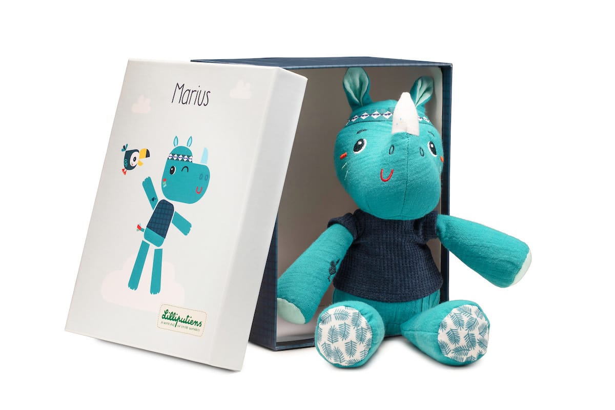 Marius, de stoere neushoorn, heeft een teder hartje en staat altijd klaar voor een knuffel. Hij is gemaakt van organisch katoen en heeft een prachtig geïllustreerde geschenkdoos.