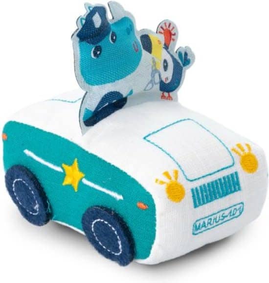 help, een inbreker ! Marius springt in zijn politiewagen en snelt ter hulp. Deze zachte auto is ideaal voor kleine handjes. Even achteruittrekken en hop, de auto vertrekt.