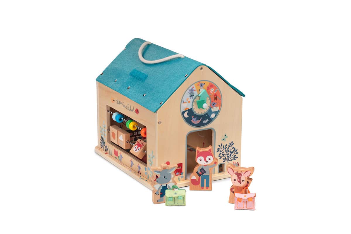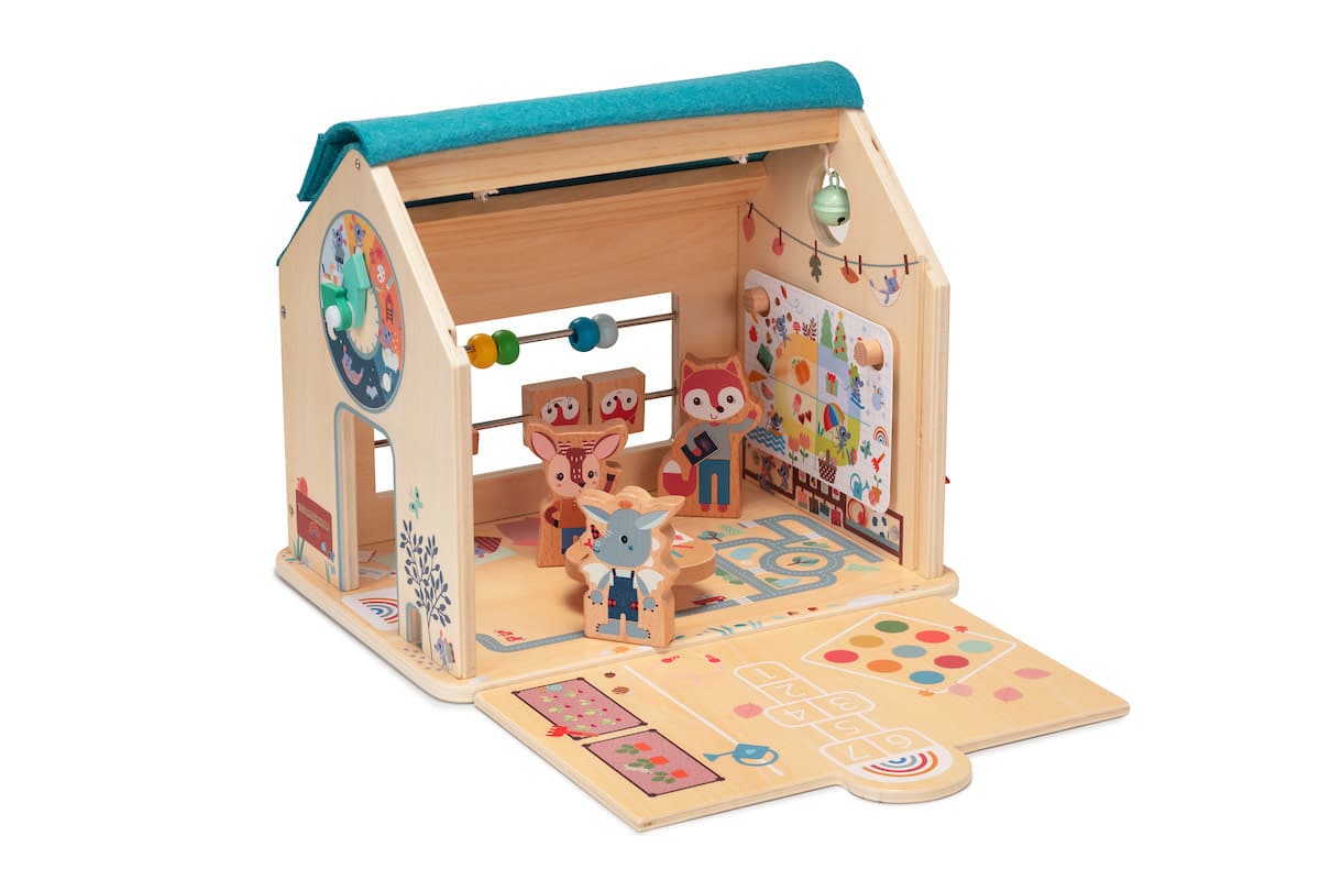 Stella en Joe vertrekken naar school met hun vilten schooltasje op de rug. Juf Alice brengt haar klasje in orde om samen met haar leerlingen een leuke schooldag te beleven. Deze knap uitgewerkte houten school bevat alle elementen om een schooldag na te spelen. De fijne motoriek en verbeelding worden zo gestimuleerd.
