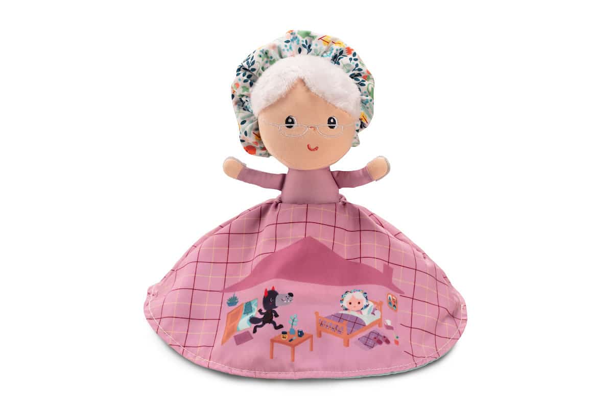 3 personages in 1 pop. Met deze originele vertelpop speel je het verhaal van Roodkapje na. In een handomdraai verander je Roodkapje in grootmoeder, of in de wolf. De illustraties op het kleed van Roodkapje beelden het verhaal uit.