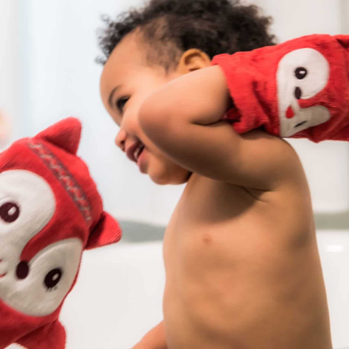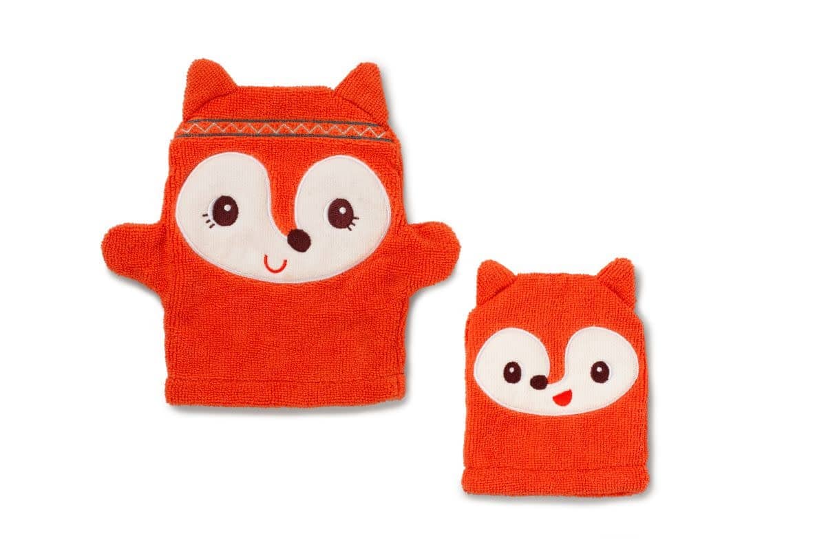 Met deze superzachte set washandjes van mama en babyvosje, wordt de wasbeurt heuse pret. De washandjes worden grappige handpoppen wanneer je ze aantrekt.Vervaardigd uit organisch katoen