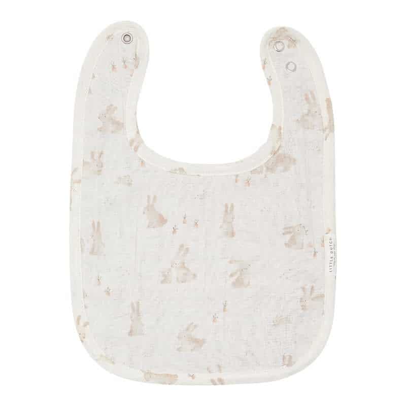 Eten en knoeien doe je in stijl met deze Little Dutch Baby Bunny slab. De slab heeft aan de achterkant een 100% biologisch katoen zachte badstof en aan de voorkant een 100% biologisch katoen voorgewassen hydrofiele kwaliteit. Hierdoor is de slab erg zacht en erg absorberend. Op de slab zitten twee drukknopen waarmee de maat aan te passen is. De slab heeft een formaat van 31 x 23 cm. Samenstelling: 100% biologische katoen Afmeting: 31x23cm