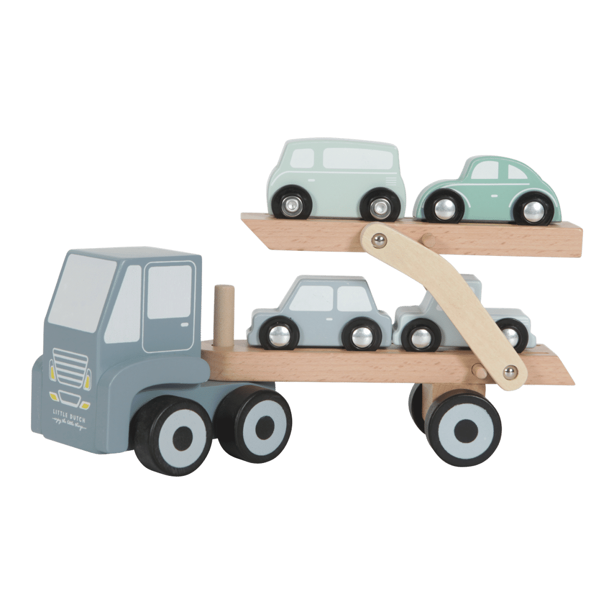 O, jee! Een auto met pech langs de weg. De houten truck rijdt met gemak de inbegrepen 4 voertuigen op en neer naar de garage. Help jij met inladen door de auto’s via de oplegger op de truck te rijden? Dan rijdt de truckbestuurder snel weer door. Een echte must have voor de kleinste autoliefhebbers!