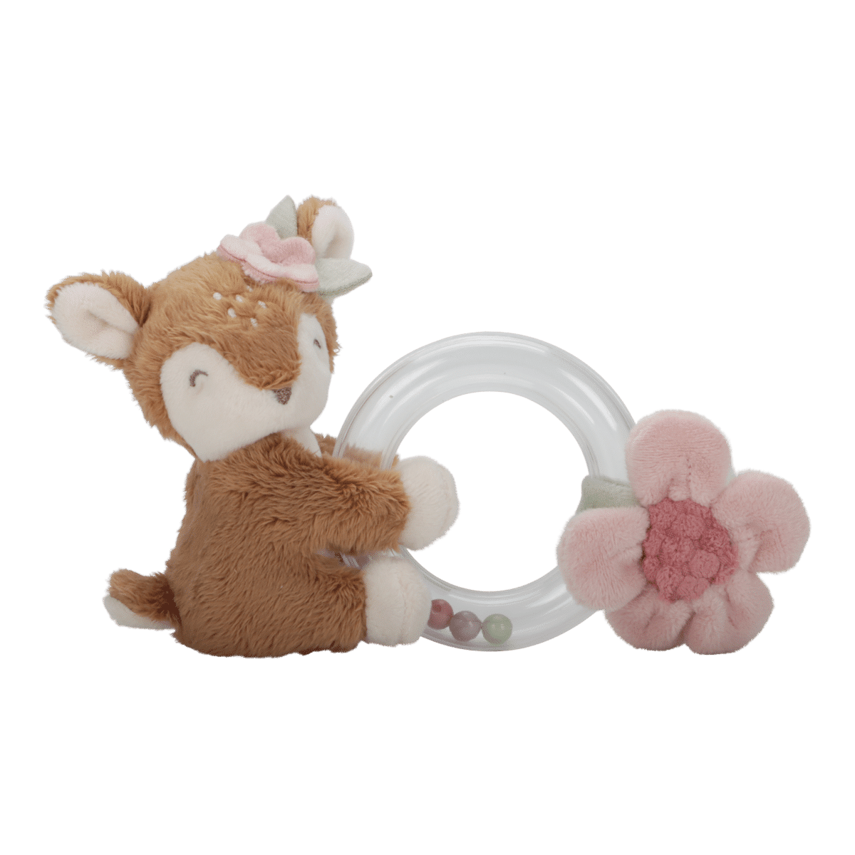 Grijp, draai en schud! Het lieve hertje met haar zachte vacht nodigt je uit om te spelen en deze ringrammelaar te laten horen. Het kleine bloemetje heeft ze speciaal voor jou geplukt om mee te kroelen. De transparante ring is gevuld met 3 kleine kraaltjes die rammelen als je kindje ermee speelt. Dit aantrekkelijke babyspeeltje prikkelt niet alleen je baby’s zintuigen en nieuwsgierigheid, maar bevordert ook de hand-oogcoördinatie.