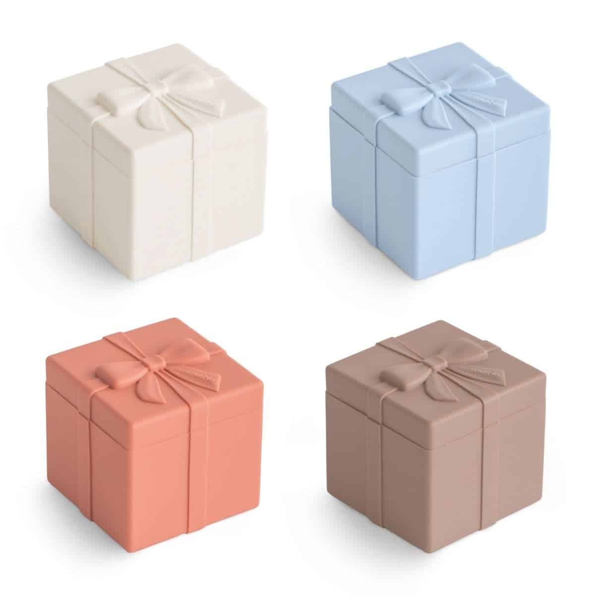 Deze kleurrijke siliconen cadeaudoosjes hebben een afneembaar deksel, zodat kinderen eindeloos kunnen mixen en matchen om hun eigen unieke “cadeautjes” te maken.