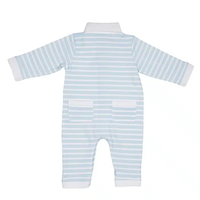 Sponsen bodysuit in het wit en lichtblauw. Dit bretelpakje heeft korte mouwen en korte beentjes en is ideaal om te dragen bij warme dagen. Er zijn knoopjes vooraan voorzien en langs onder is er ook een drukknopensluiting voorzien.