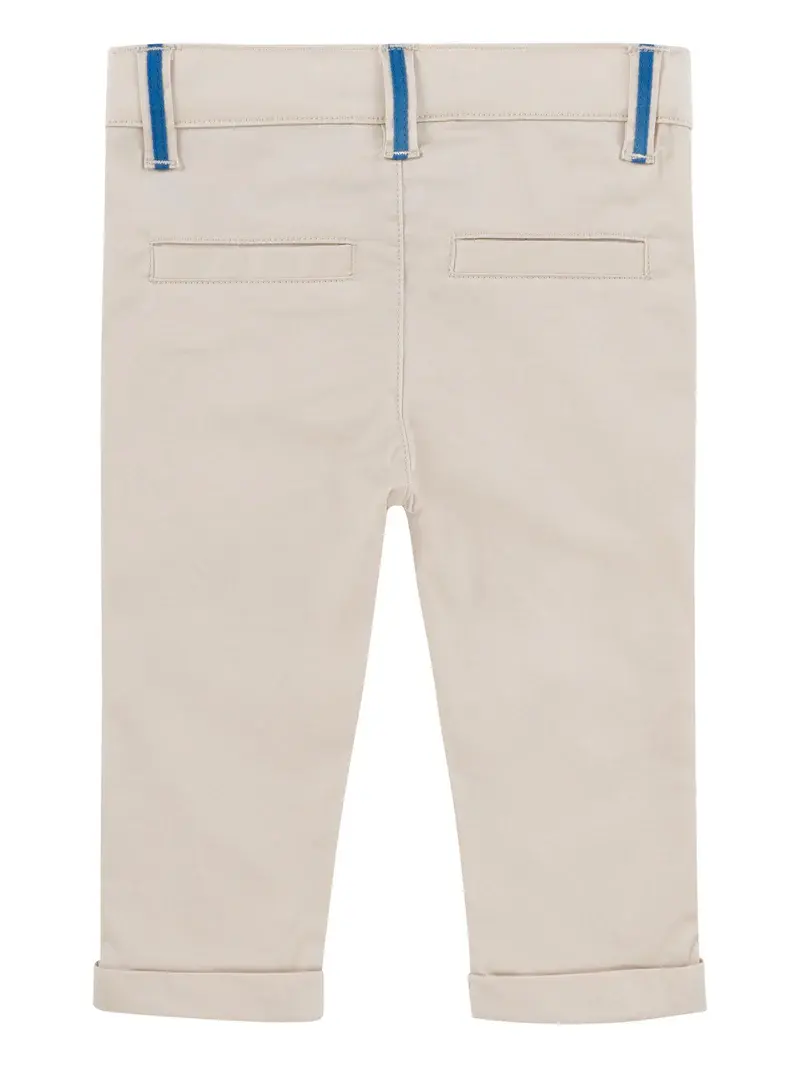 Licht beige katoenen broek waarbij de riemlussen afgewerkt zijn met jeans blauw, ook voorzien van twee zakken vooraan en twee zakken achteraan. Vooraan is een sluiting voorzien d.m.v. een drukknoop en de elastische tailleband aan de binnenzijde is verstelbaar om een optimaal draagcomfort.